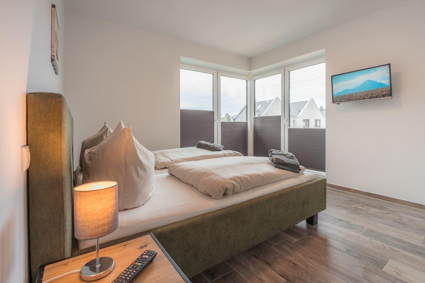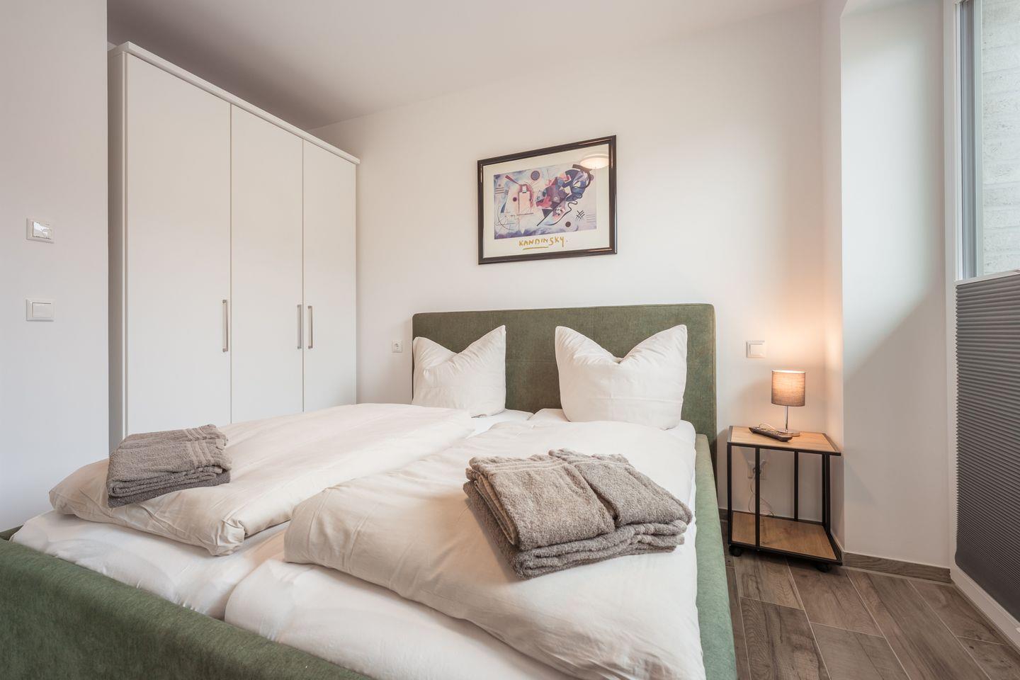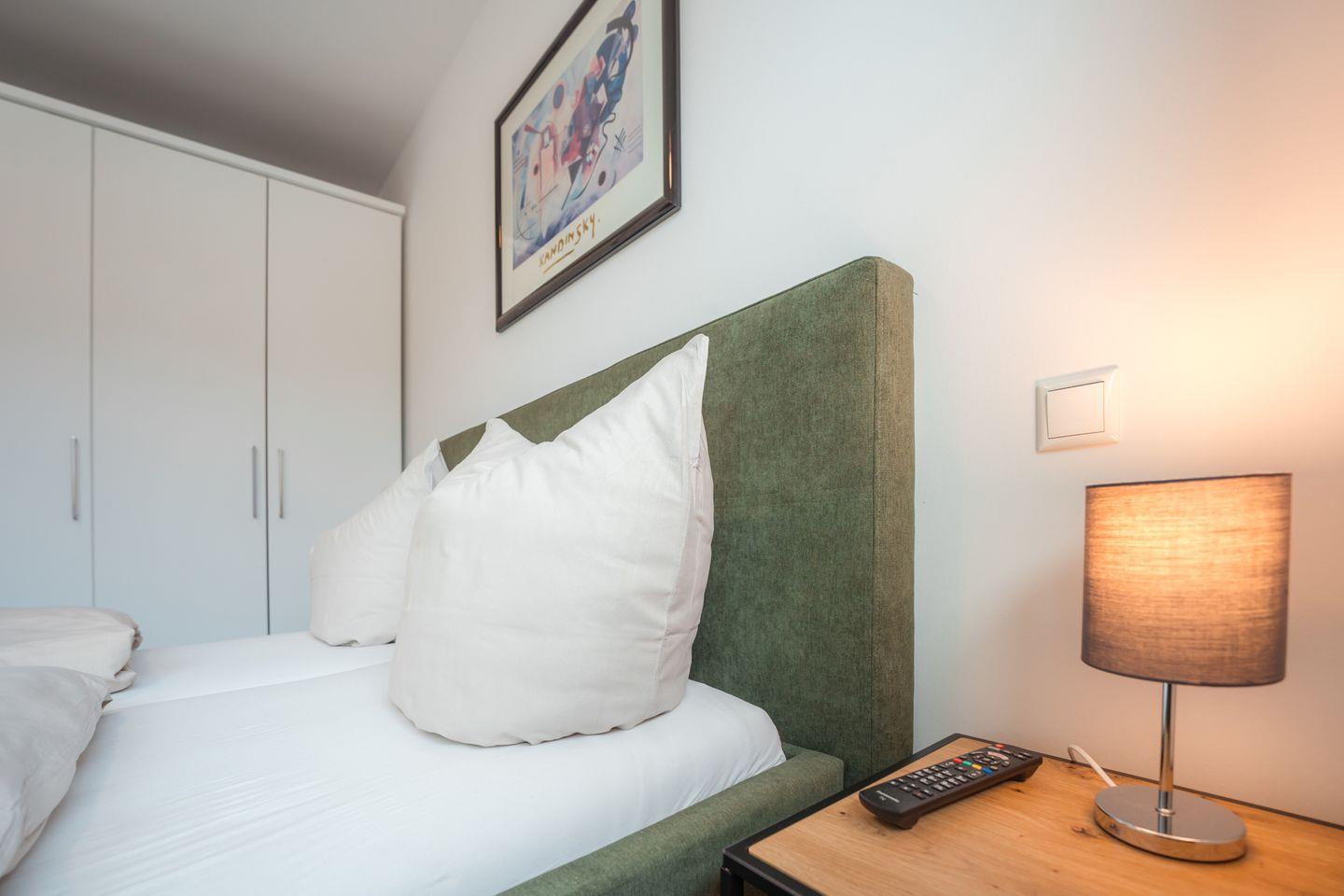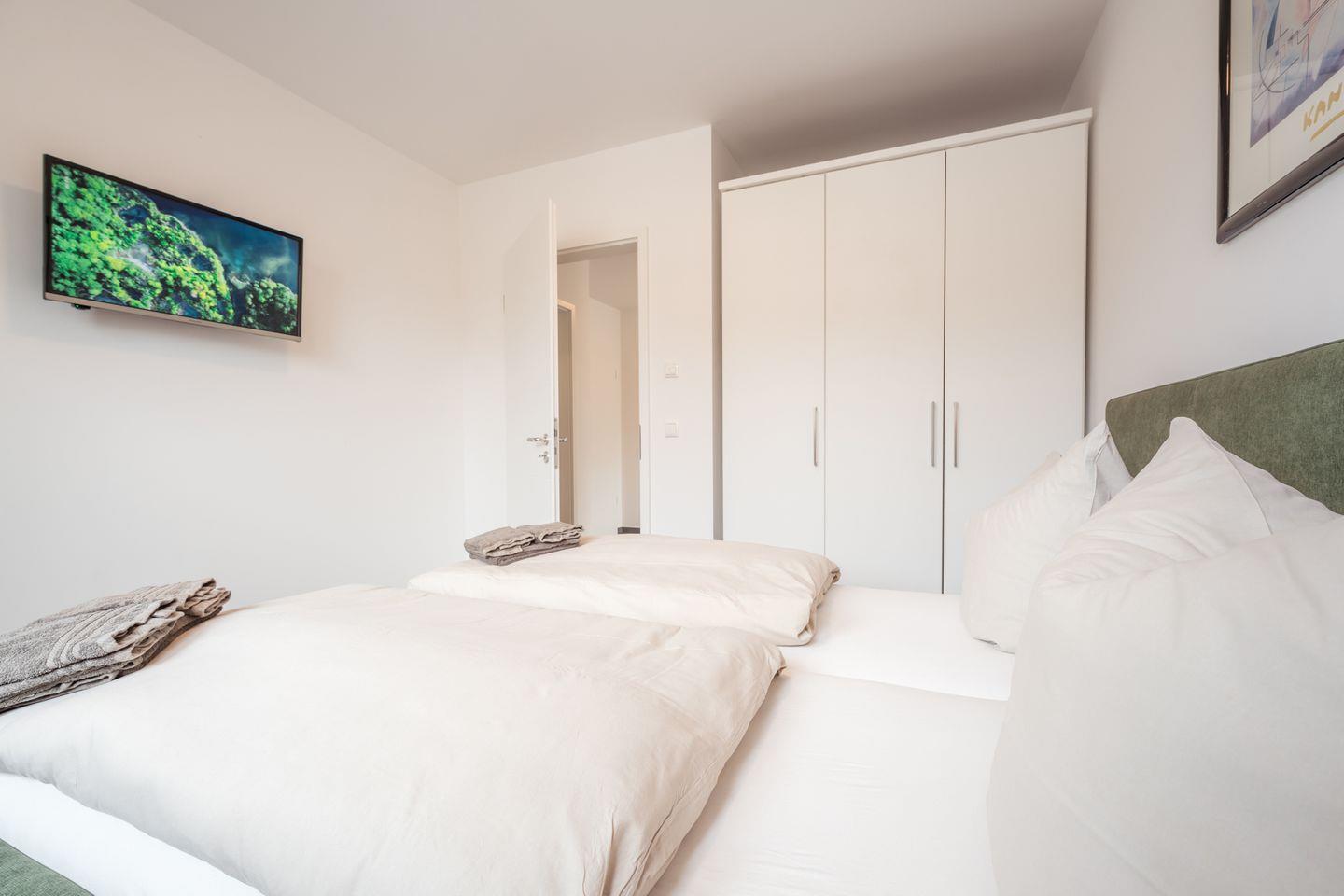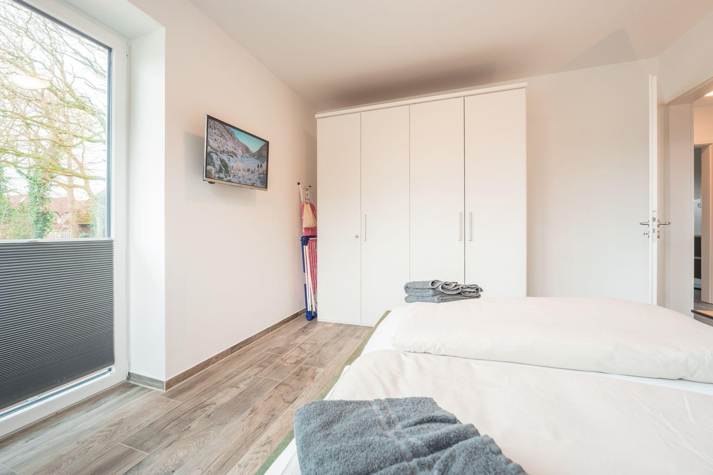 Schlafzimmer 1: Doppelbett (2 Einzelmatratzen 90 x 200 cm), Leselampen, Kleiderschrank, Verdunklungs-Plissees, Flachbildfernseher, Bettwäsche auf Anfrage