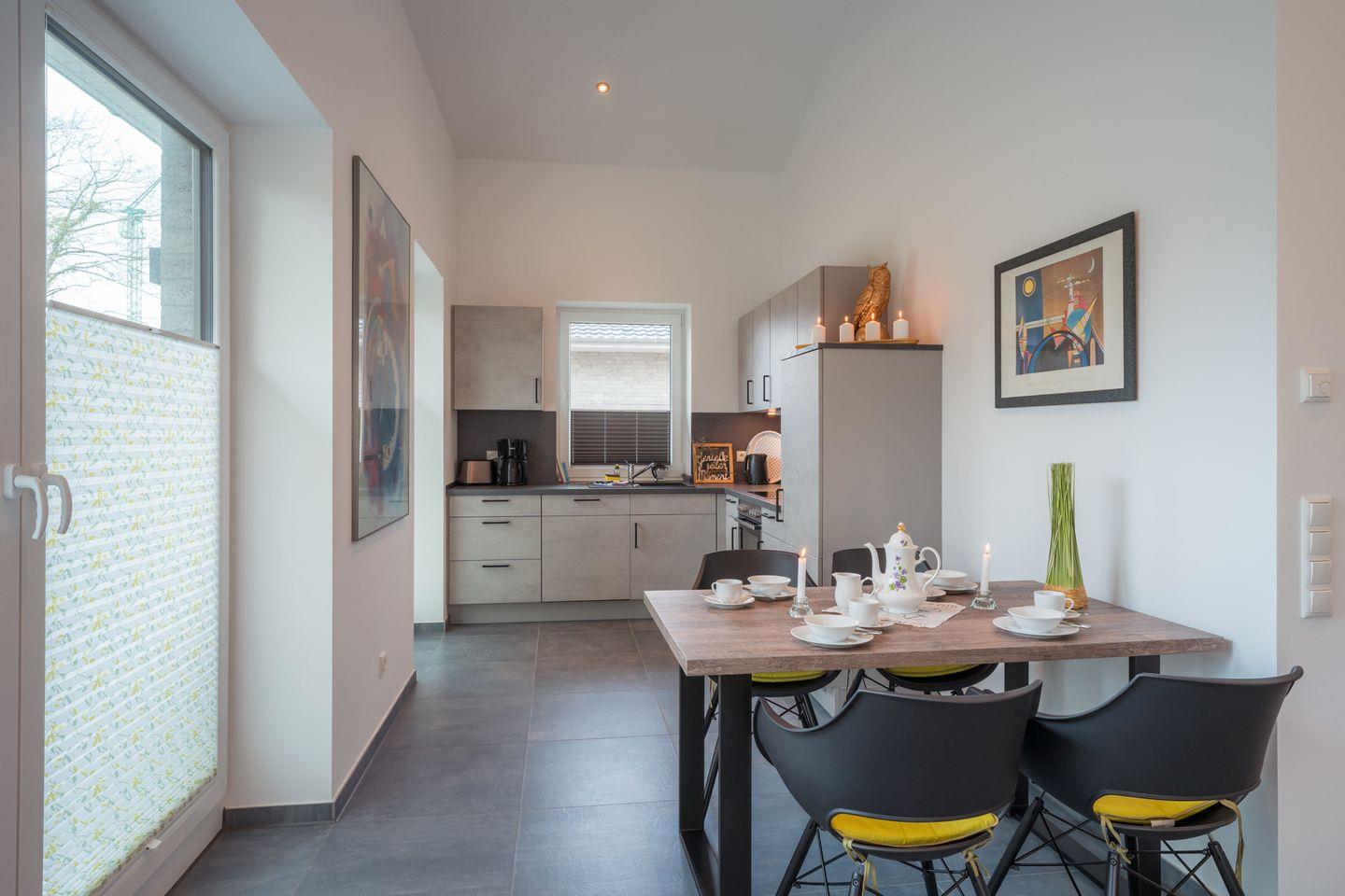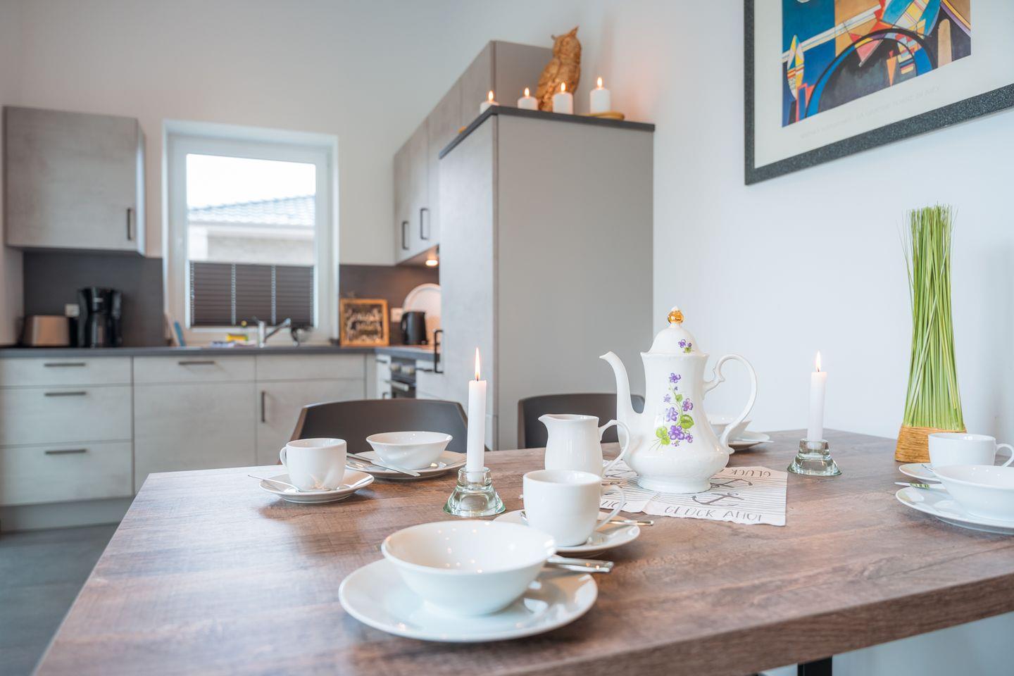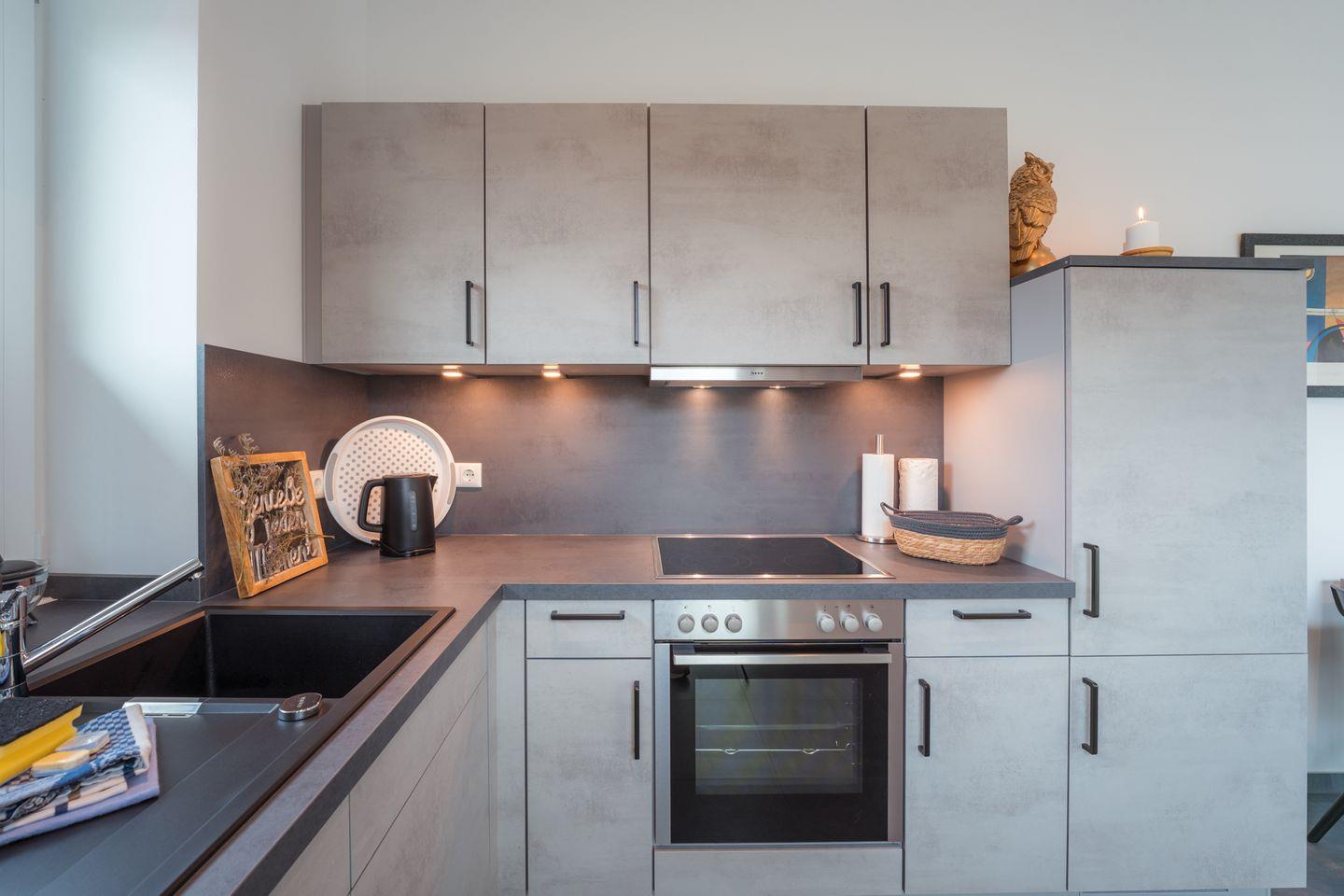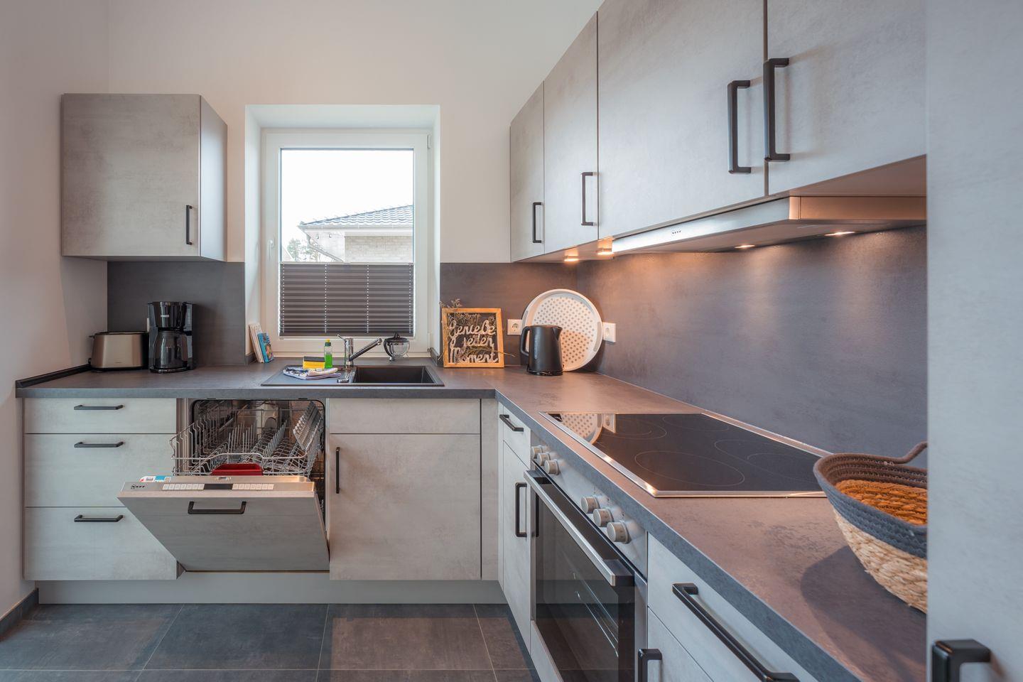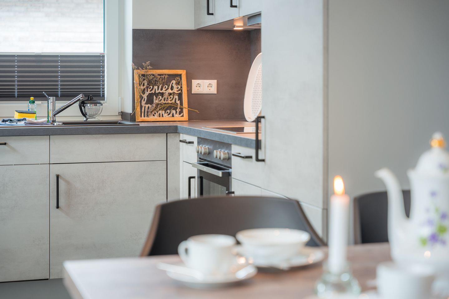 Küche und Haushalt: Einbauküche, Kühlschrank mit kombiniertem Gefrierfach, 4-Zonen Cerankochfeld, Dunstabzugshaube, Backofen, Geschirrspüler, Toaster, Eierkocher, Wasserkocher, Kaffeefiltermaschine (Filtergröße 4), hochwertiges Geschirr und Besteck