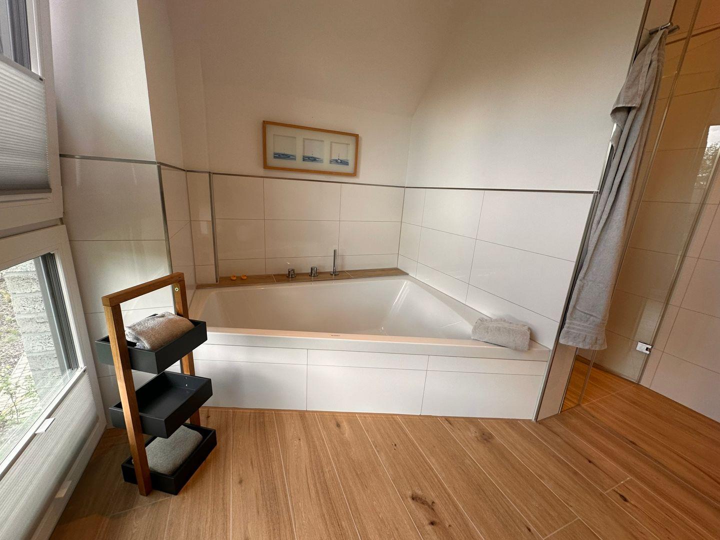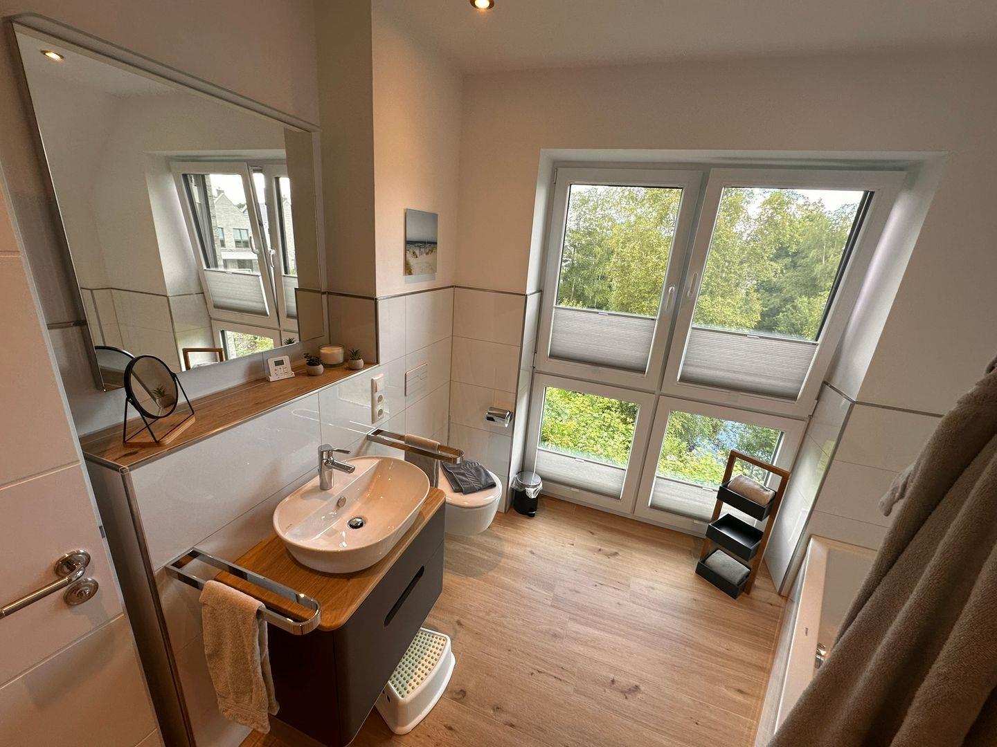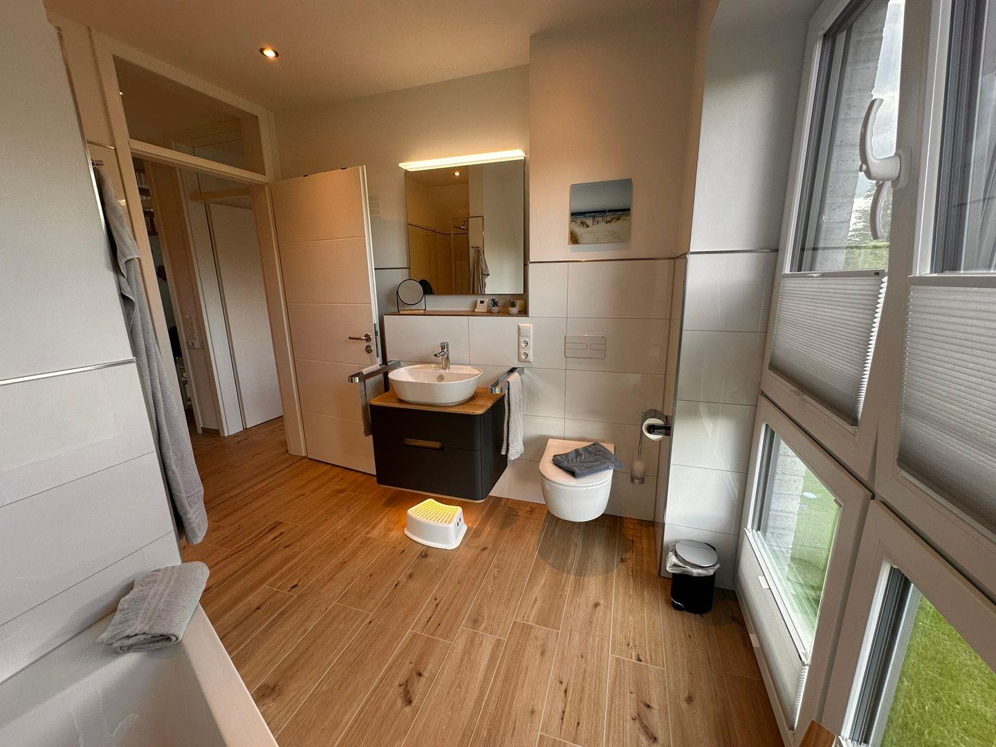 Tageslichtbad: bodentiefe, barrierefreie Sommerregendusche, Waschtischanlage mit Spiegel, Föhn, WC, Handtuchheizung, Waschmaschine und Trockner, Handtücher & Badematten auf Anfrage