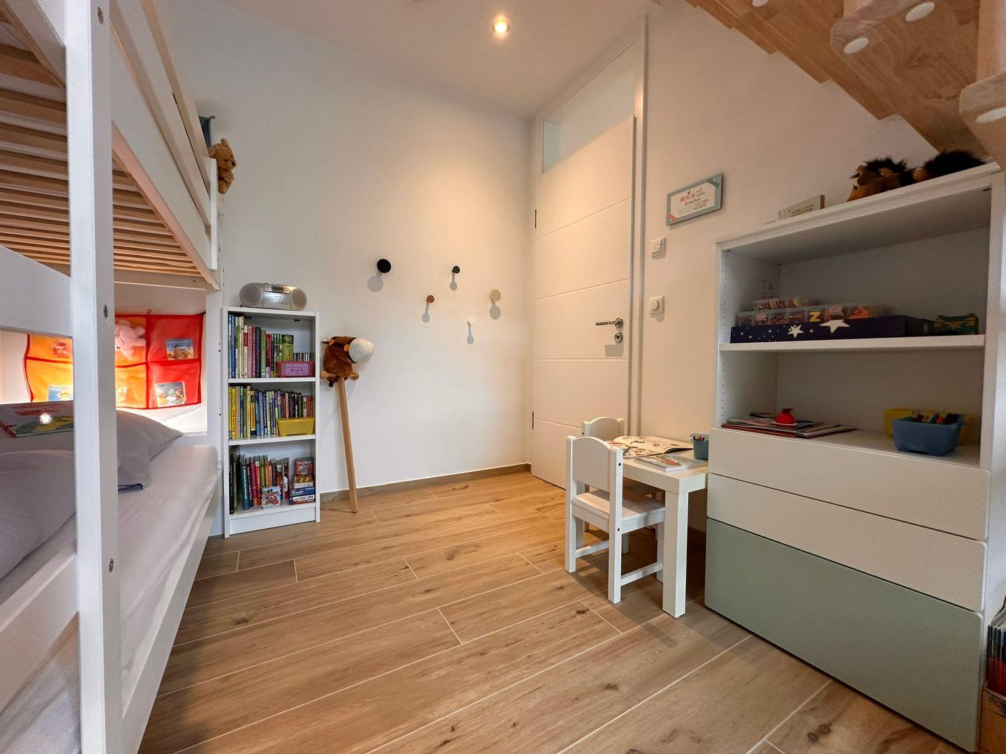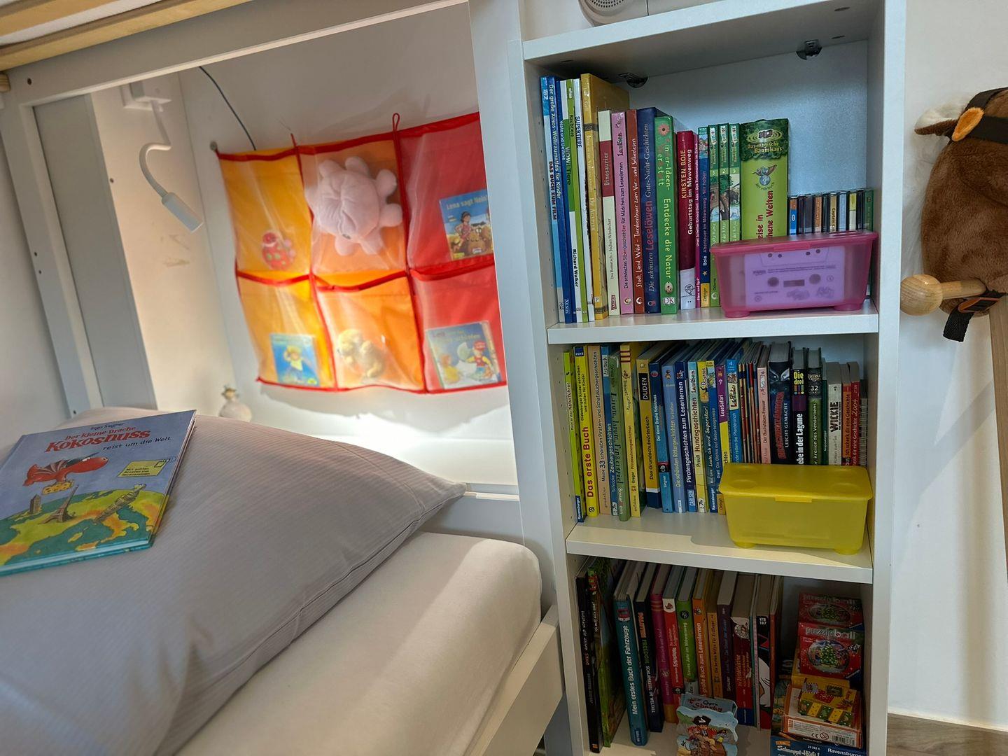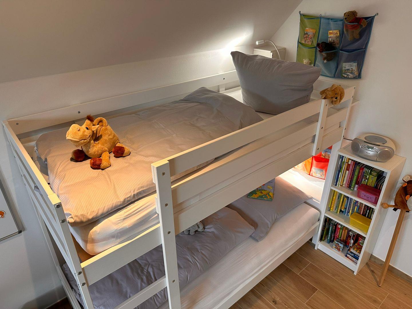 Kinderzimmer 1: Hochbett mit 2 Schlafplätzen je 90x200cm, Leselampen, Staufächer am Bett, Schrank, Schaukelpferd, Bücher, Spielzeug, Zugang zum extra Spielzimmer auf dem hellen ausgebauten Spitzboden.