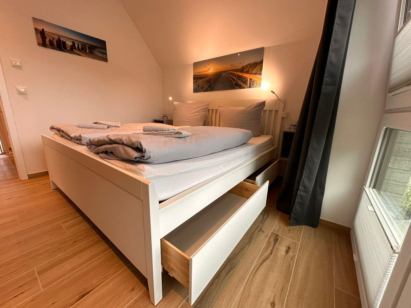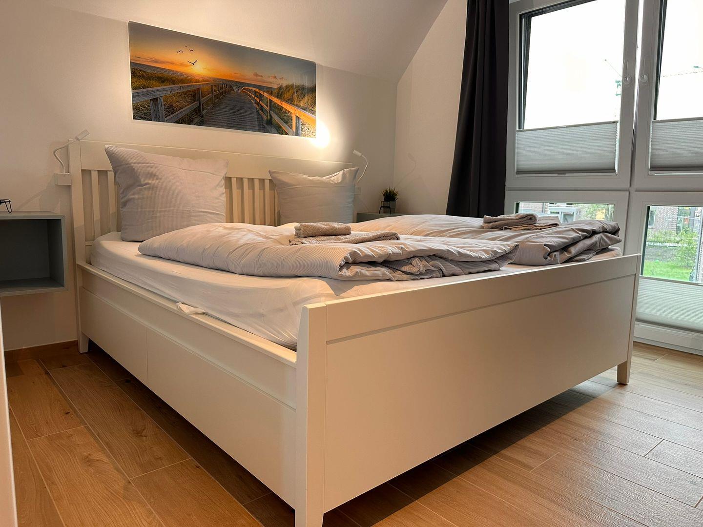Schlafzimmer 2: Doppelbett (zwei einzelne Matratzen 90x200 cm), Leselampen, Kleiderschrank, Verdunklungsgardinen, Bettwäsche auf Anfrage