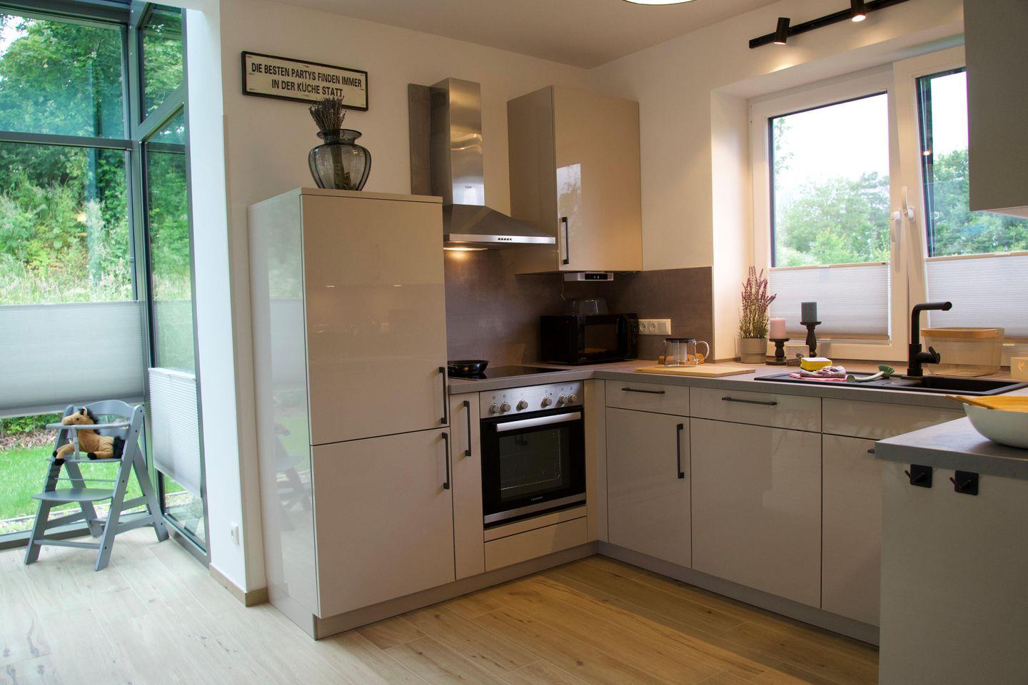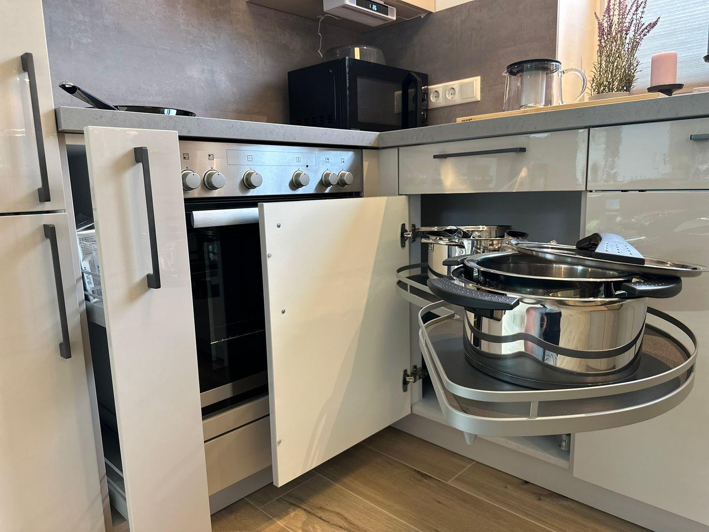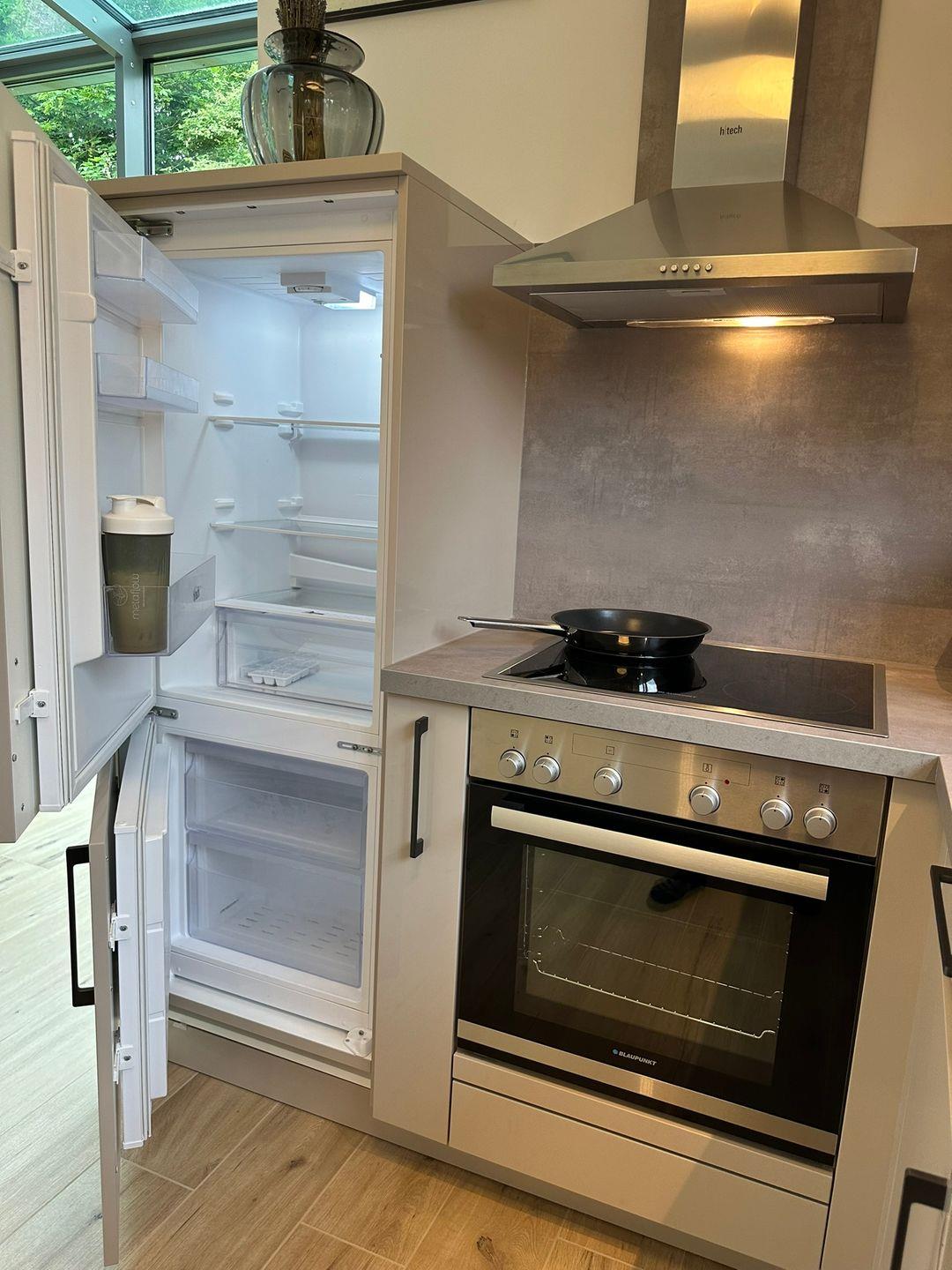• Moderne Küche mit Herd, Backofen, Mikrowelle, geräumigem Kühlschrank mit Gefrierfach,