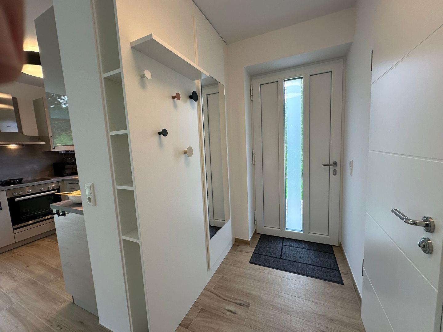 Flur: Flur mit Garderobe, Schuh- und Garderobenschrank, Schuhanzieher, Bügelbrett + Bügeleisen, Staubsauger, Besen, Handfeger mit Kehrblech, Eimer und Bodenwischer, Wäscheständer