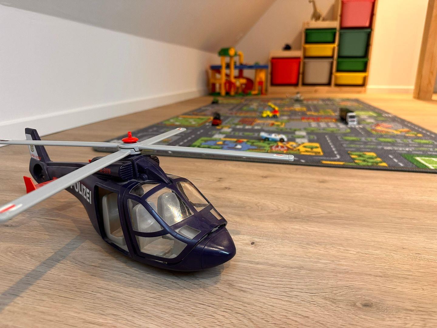 Spielzimmer 2: Spielteppich, Puzzle, Bücher, Autos, Spielküche komplett bestückt, Playmobil. Das große, komplett ausgestattetes Spielzimmer im Spitzboden hat kindergesicherte Velux-Fenster.