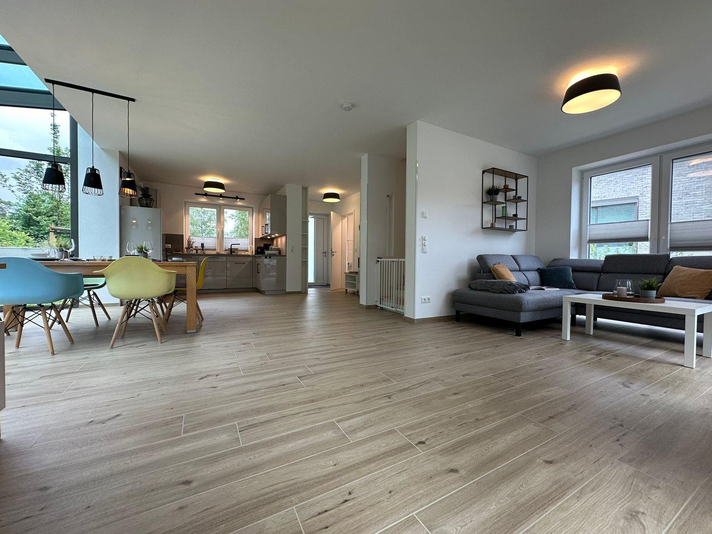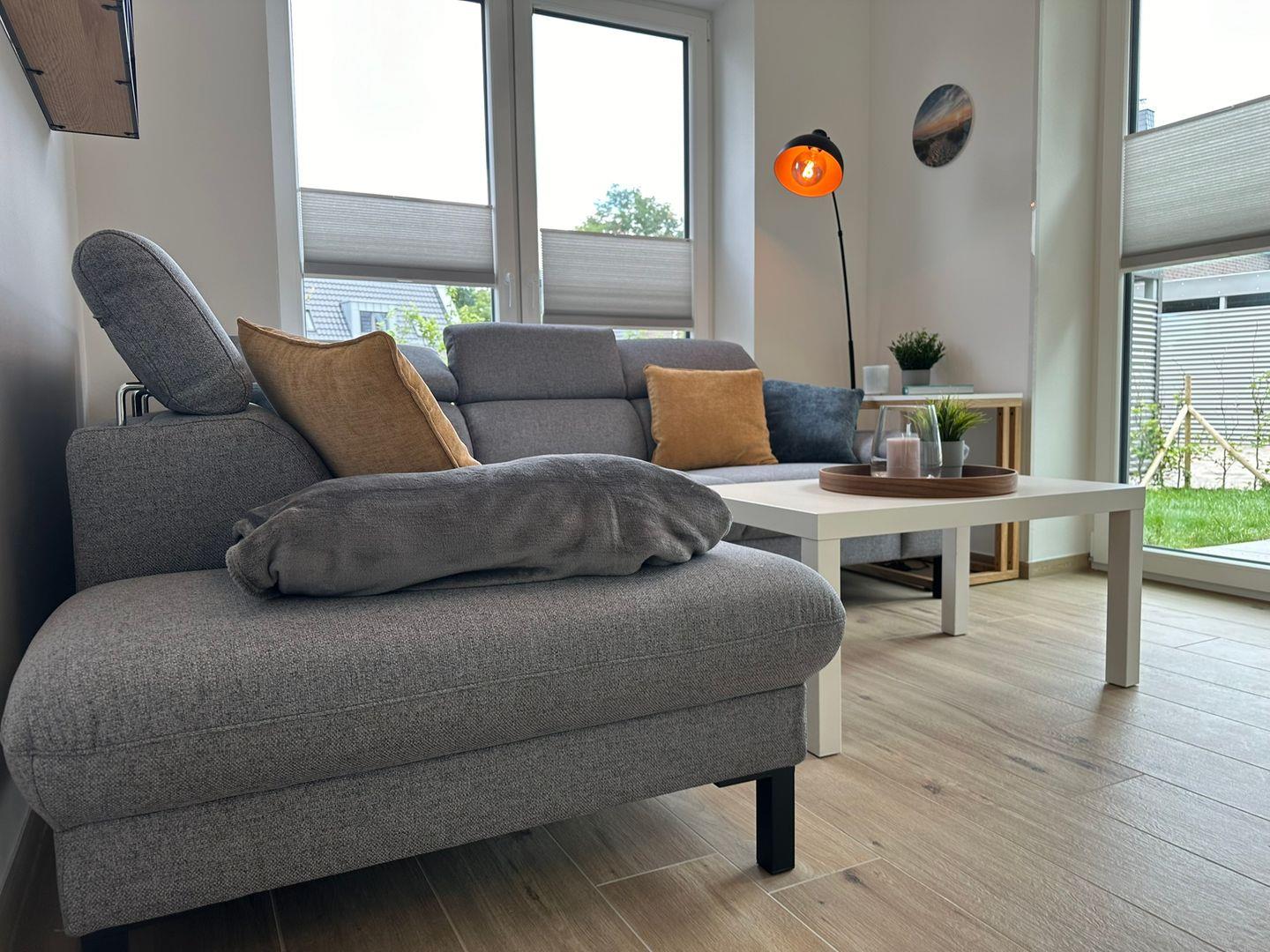 Ferienhaus mit Spielzimmer und Garten Unser modernes und komfortables Ferienhaus in Dangast bietet Platz für bis zu 6 Personen und verspricht einen erholsamen Urlaub an der Nordsee. Die bodentiefen Fenster lassen viel Tageslicht herein und sorgen für ein Gefühl, mitten in der Natur zu sein. Besonders im Herbst und Winter bietet das helle Wohnzimmer eine kuschelige Atmosphäre.