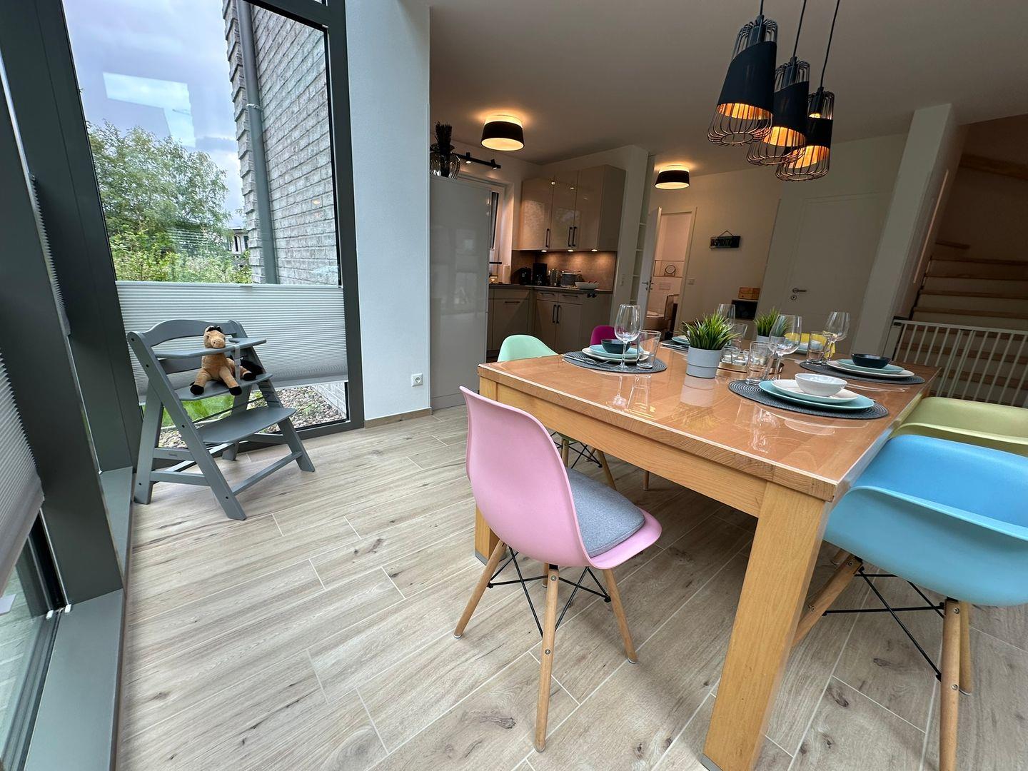 Aufteilung-Zimmer: 112 qm plus Spielzimmer, 1 Wohn-Essbereich, 3 Schlafzimmer, 1 Spielzimmer, 2 Badezimmer mit Regendusche plus 1 x große Eckbadewanne, 1 Terrasse mit großem Garten & Outdoor-Spielzeug, Bollerwagen, Sandspielzeug für den Strand/Garten