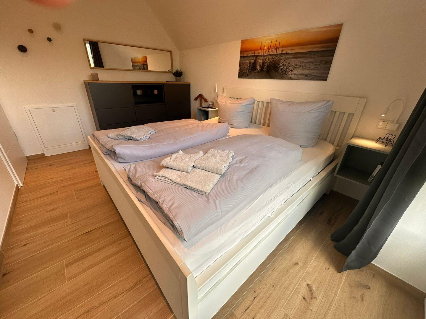Schlafzimmer 1: Doppelbett (zwei einzelne Matratzen 90x200 cm), Leselampen, Highboard, Kleiderbuttler, Verdunklungsgardinen, Flat TV, Bettwäsche auf Anfrage,