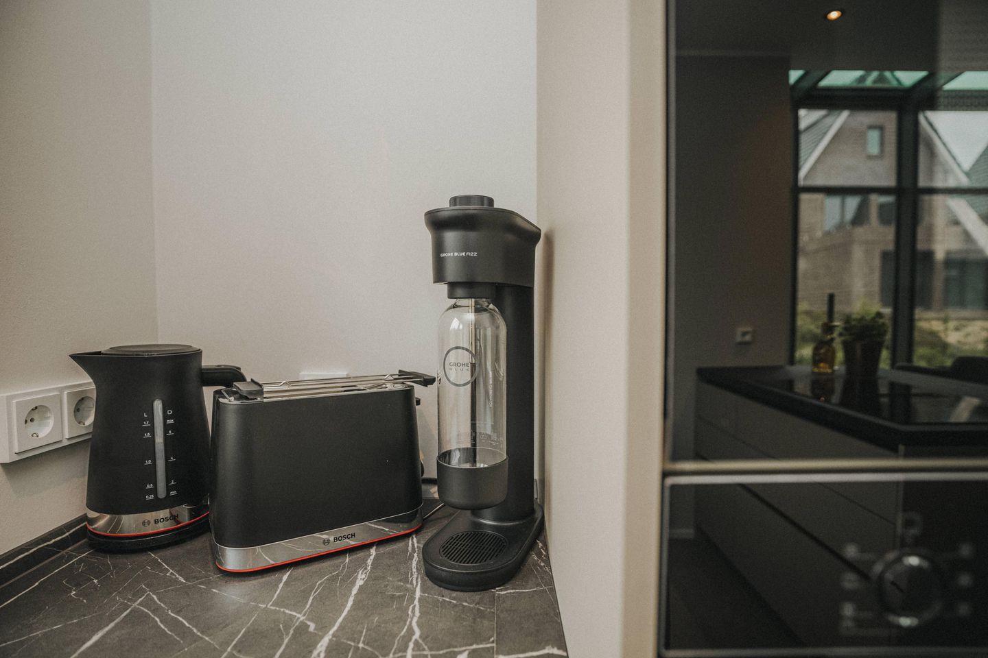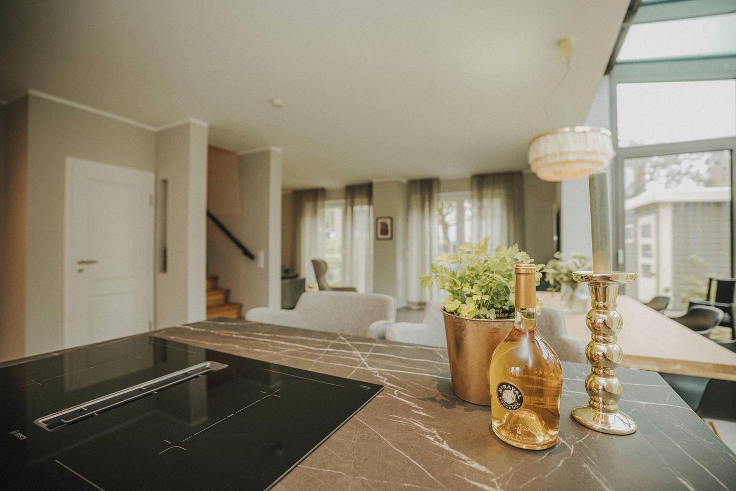 Ästhetik und Qualität zieht sich durch das ganze Haus, ob drinnen oder draußen. In dem Wohnraum ist eine offene Küche integriert, mit hochwertigen Geräten von Markenherstellern. Ob Geschirrspüler, Ofen, Herd mit integrierter Dunstabzugsfunktion, Kühl- und Gefrierschrank, Wassersprudler, Toaster, Wasserkocher, Nespressomaschine oder die gesamte Ausstattung mit Weingläsern, Geschirr, Besteck, Gläsern und allem was dazu gehört – Sie werden nichts vermissen.