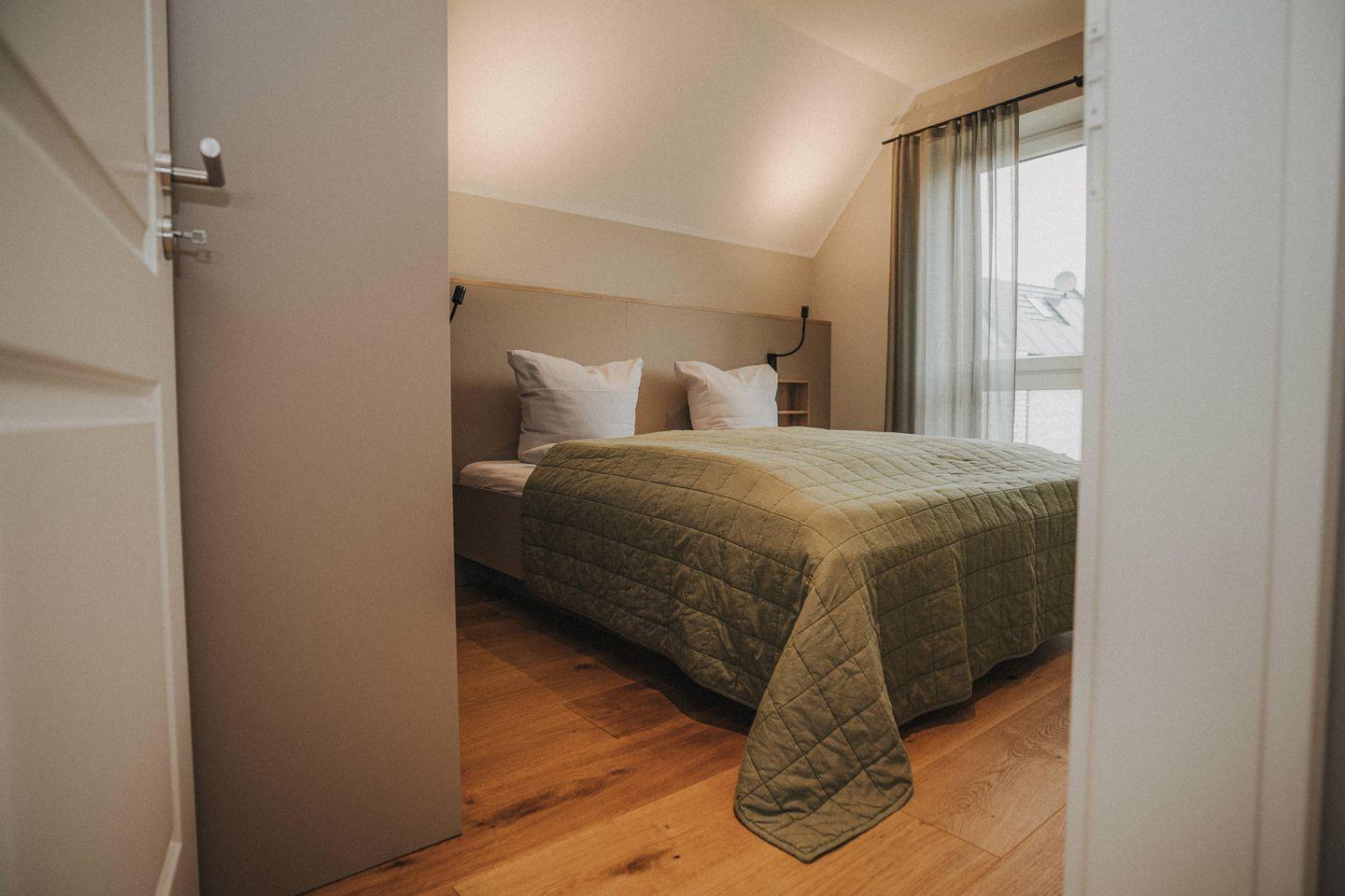 Im Obergeschoss befinden sich drei Schlafzimmer, deren maßgefertigte Einbauschränke viel Stauraum bieten. Zwei Schlafzimmer sind mit ebenfalls maßgefertigten hochwertigen Doppelbetten (1,80 m x 2,00 m) ausgestattet. In den beiden Zimmern befindet sich ebenfalls ein LED-TV. Das vom Schreiner angefertigte zweigeschossige Hochbett im dritten Schlafzimmer bietet ausreichend Platz für kleine und große Gäste.