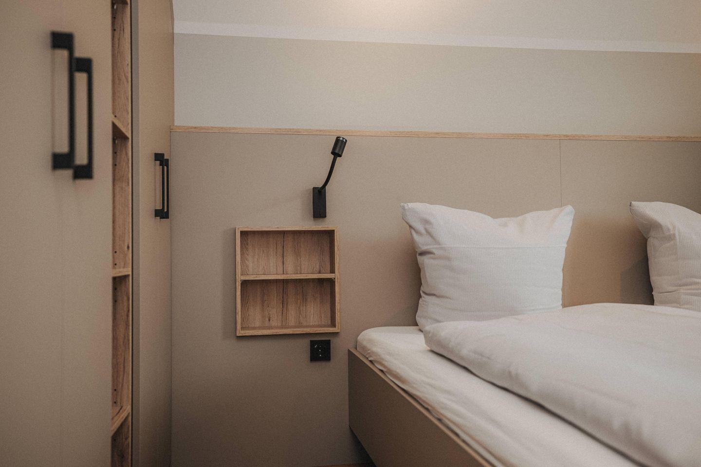 Schlafzimmer 2: Doppelbett (Maße: 180 x 200 cm / 2 Einzelmatratzen 90 x 200 cm), Nachttische, Leselampen, Kleiderschrank, Smart-TV, Verdunklungsmöglichkeit