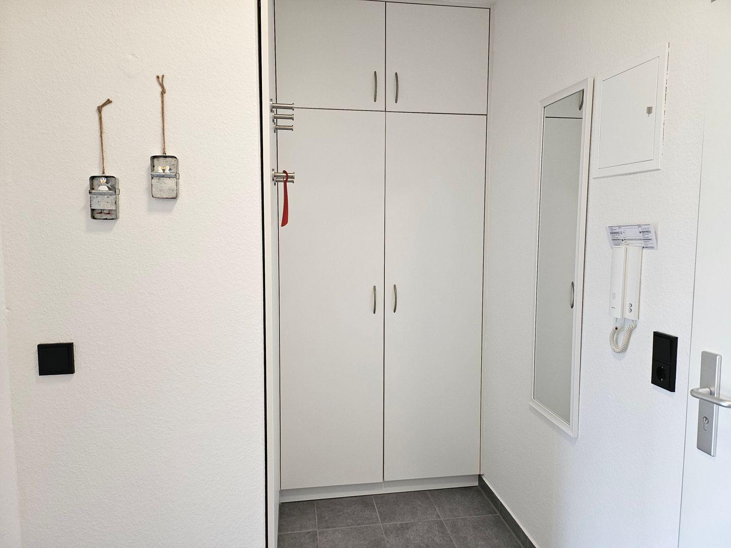 Der Eingangsbereich erzeugt sofort ein wohles Gefühl und bietet gleichzeitig einen maßgefertigten Einbauschrank mit genügend Stauraum.