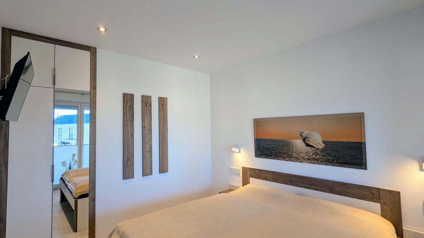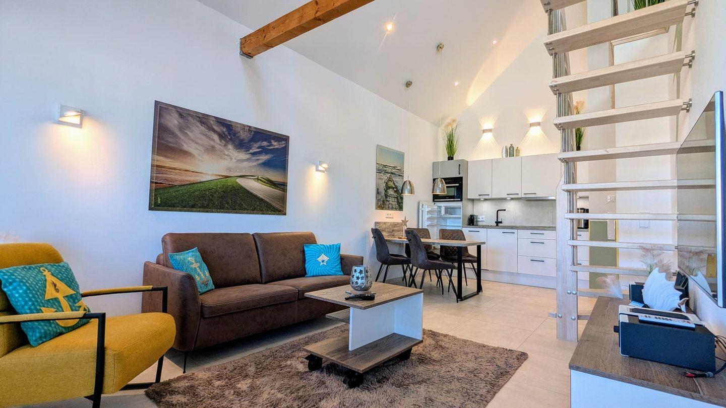 Genießen Sie Ihre Zeit im lichtdurchfluteten Wohnzimmer, das mit einem gemütlichen Sofa, einem Sessel und einem modernen TV-Bereich ausgestattet ist. Für zusätzliche Unterhaltung sorgen WLAN und verschiedene Spiele, die im Apartment zur Verfügung stehen. Auf dem überdachten Balkon können Sie am Morgen bei einer Tasse Kaffee die frische Nordseeluft genießen und den Blick über die Landschaft schweifen lassen.