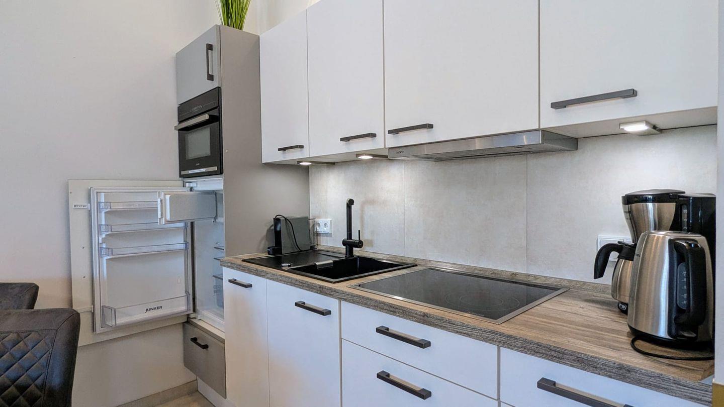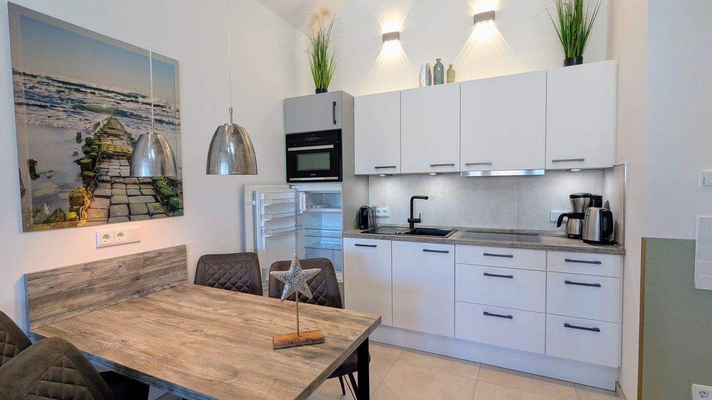 Das offene Wohnkonzept verbindet die vollständig ausgestattete Küche mit einem einladenden Wohnbereich, der Ihnen zahlreiche Annehmlichkeiten bietet. Zu den modernen Küchengeräten gehören eine Spülmaschine, ein Backofen, ein Kühlschrank, eine Mikrowelle und eine Kaffeemaschine. Hier können Sie schmackhafte Mahlzeiten zubereiten und gemütlich am Esstisch verbringen.