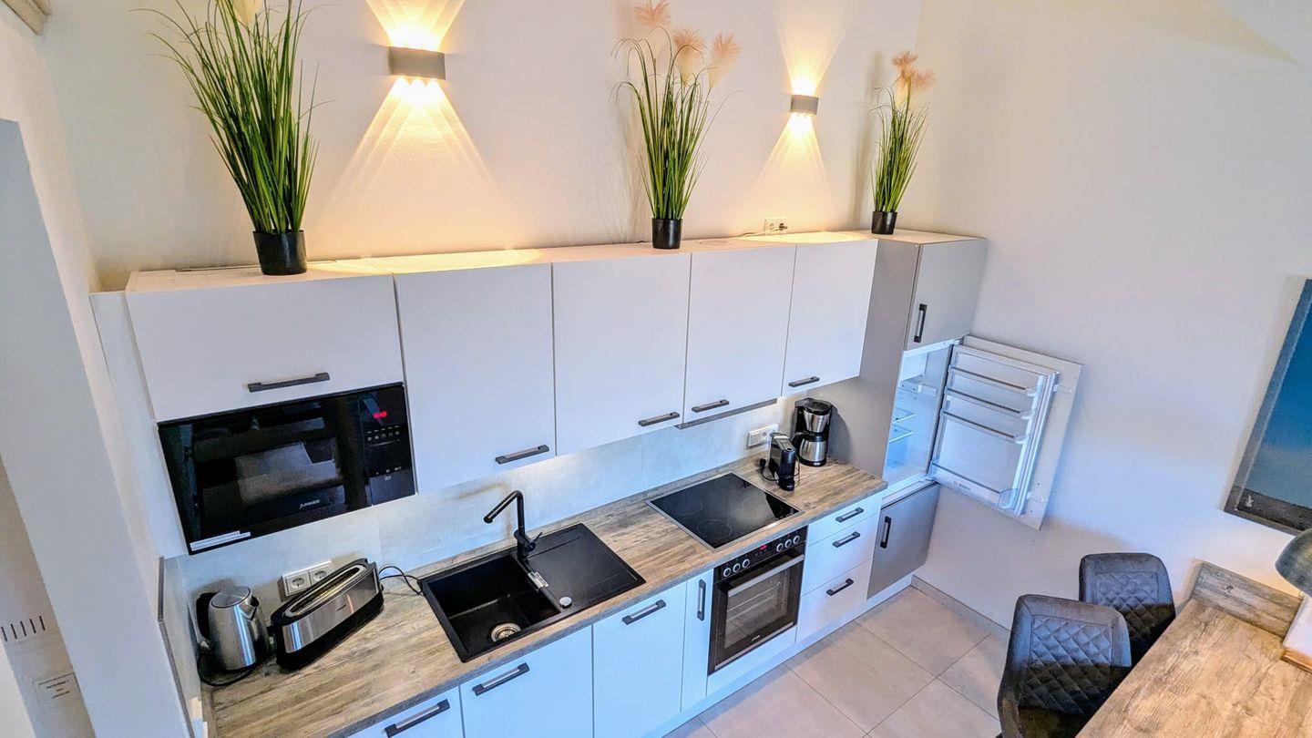 Die voll ausgestattete offene Küche lädt zum Kochen ein.