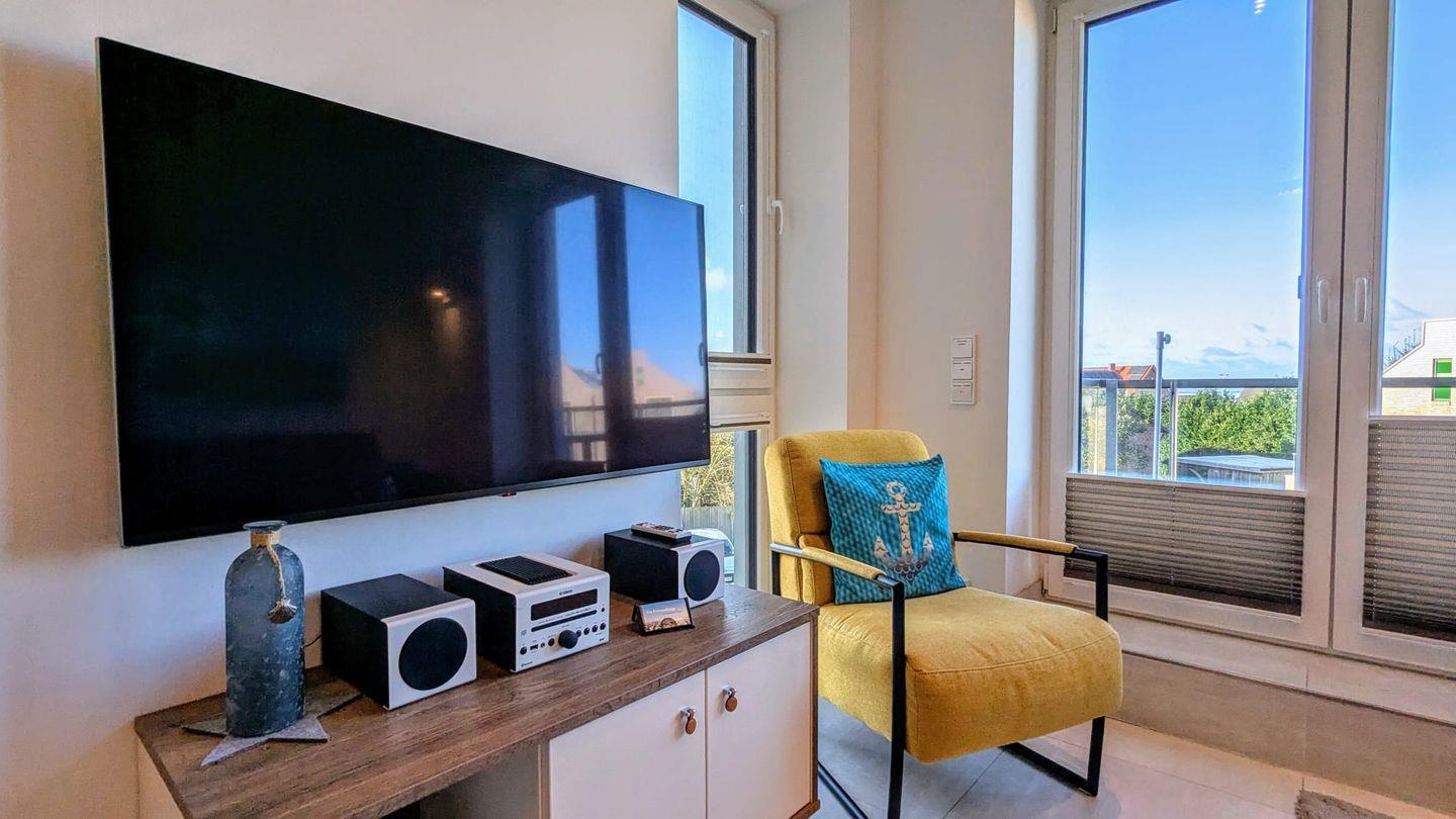 Ein weiteres Highlight ist der Zugang zum Balkon, von dem Sie eine herrliche Sicht auf die Umgebung genießen können. Die großen Fenster der Ferienwohnung sorgen nicht nur für einen großzügigen Lichteinfall, sondern bieten auch einen Blick auf das nahegelegene Meer. Bei schönem Wetter können Sie nach einem aufregenden Tag an der Nordsee auf dem Balkon entspannen und den Sonnenuntergang bewundern.