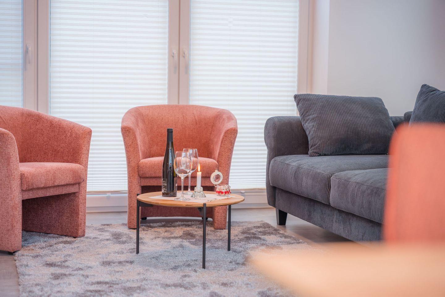 Wohnzimmer: Wohnzimmercouch, Flachbildfernseher, Empfang deutschsprachiger TV-Programme (SAT-Anlage), Sideboard