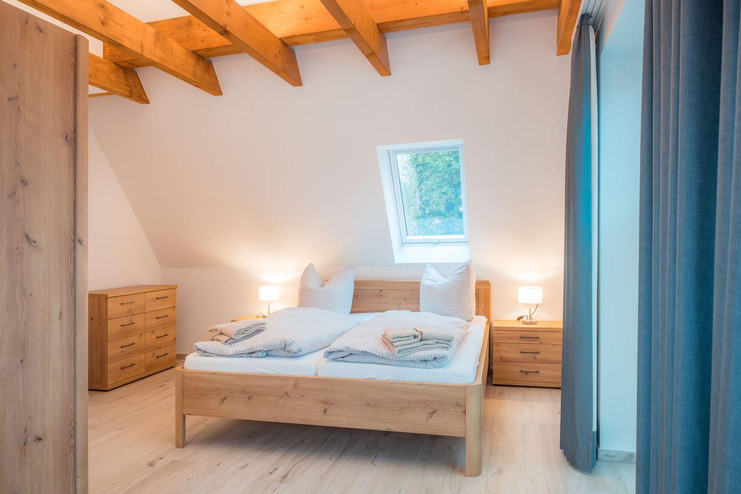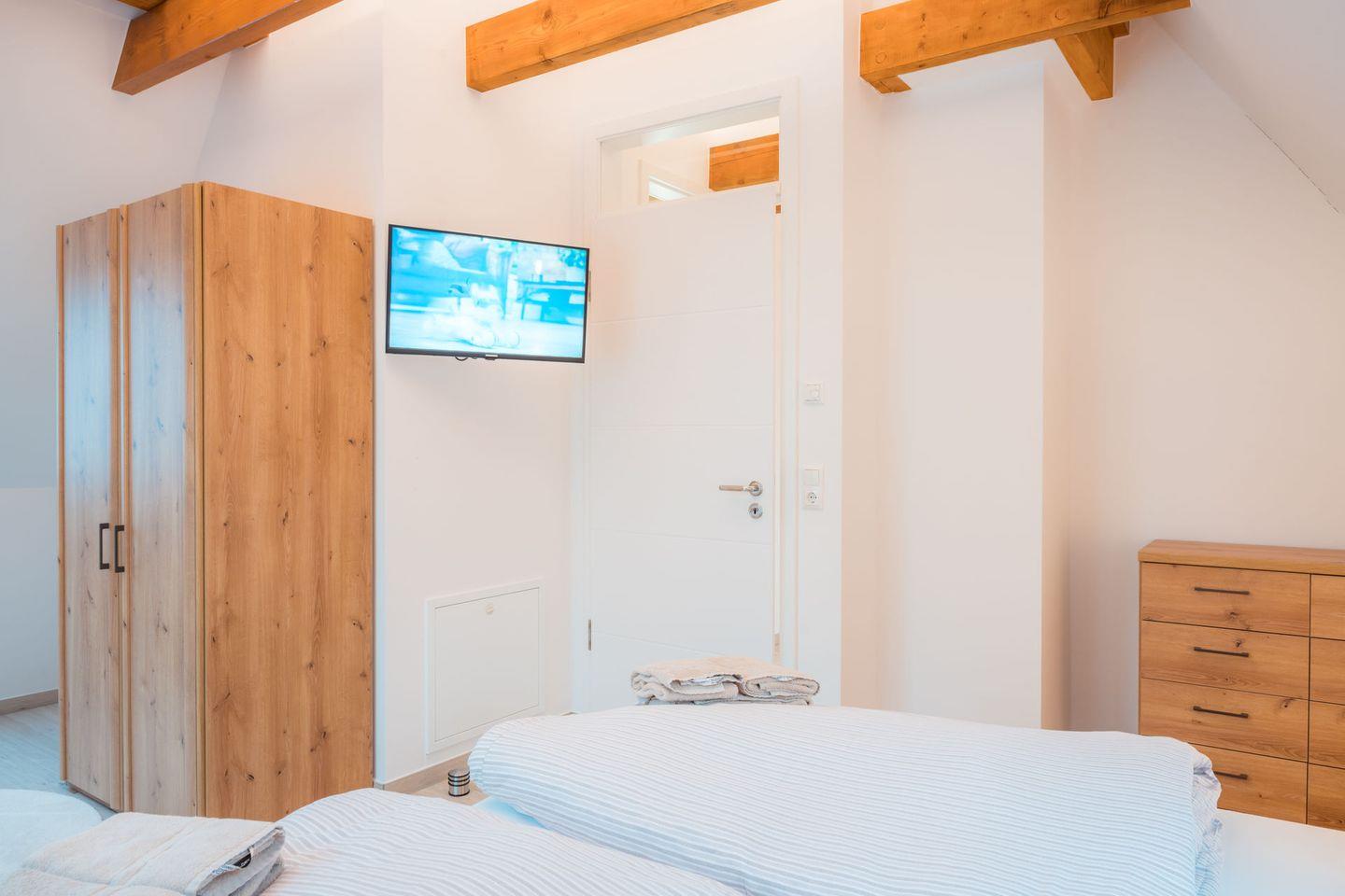 Schlafzimmer 2: Doppelbett (Maße: 180 x 200 cm, 2 Einzelmatratzen je 90x200cm), Nachttische, Leselampen, Kleiderschrank, Flachbildfernseher