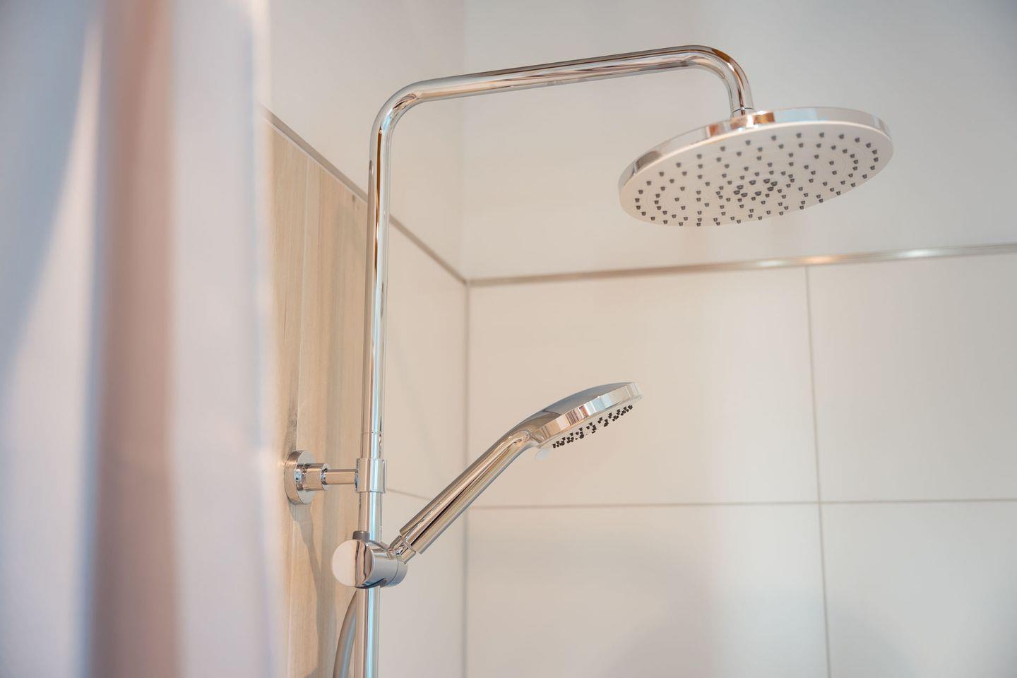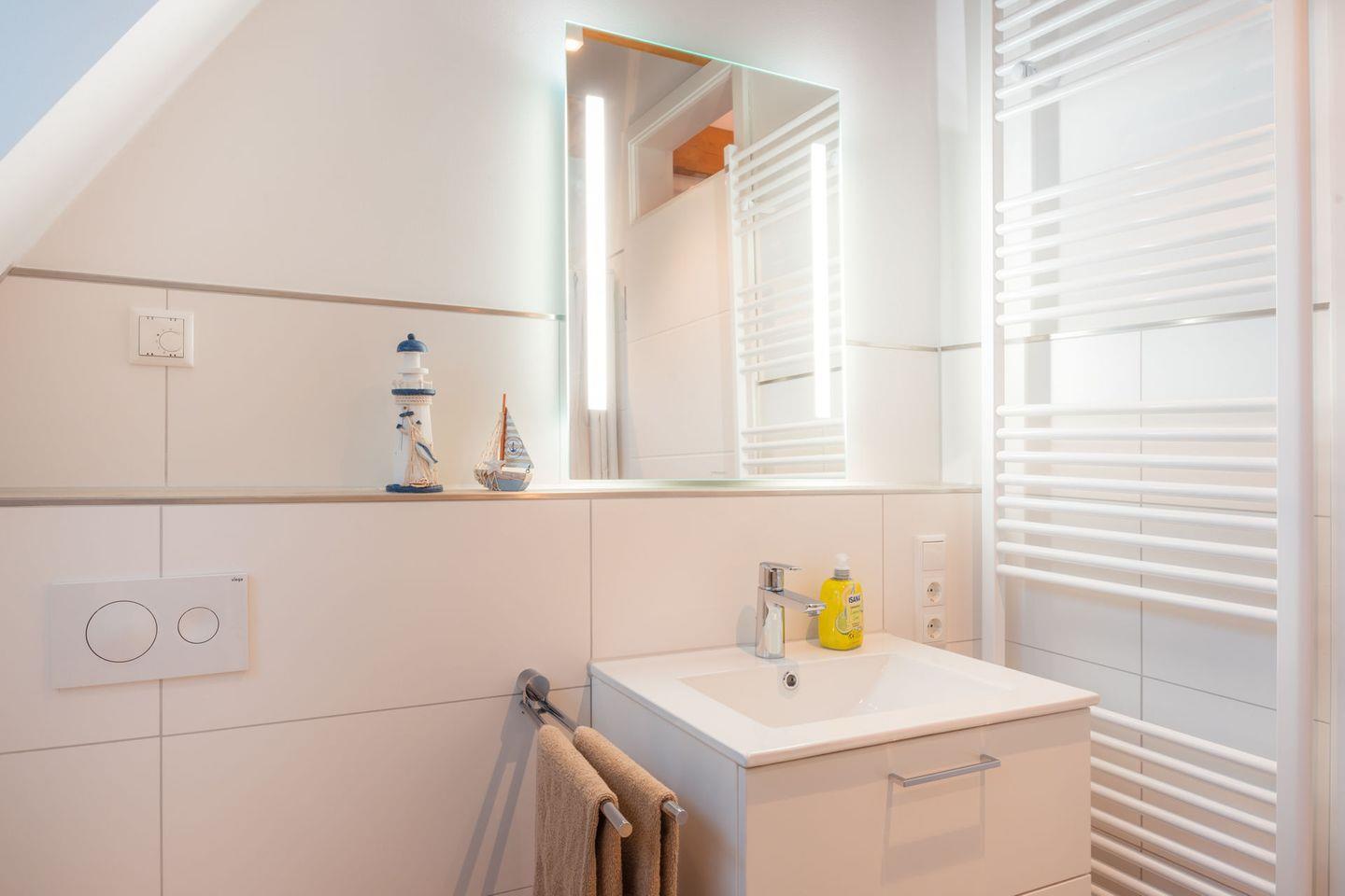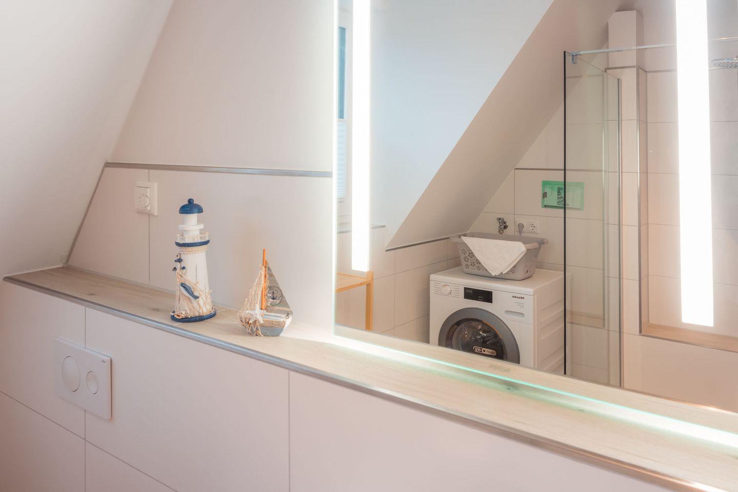 Bad und Sanitär: 2 bodentiefe, barrierefreie Sommerregenduschen, Waschtischanlage mit Spiegel, WC, Föhn, Waschmaschine, Sauna