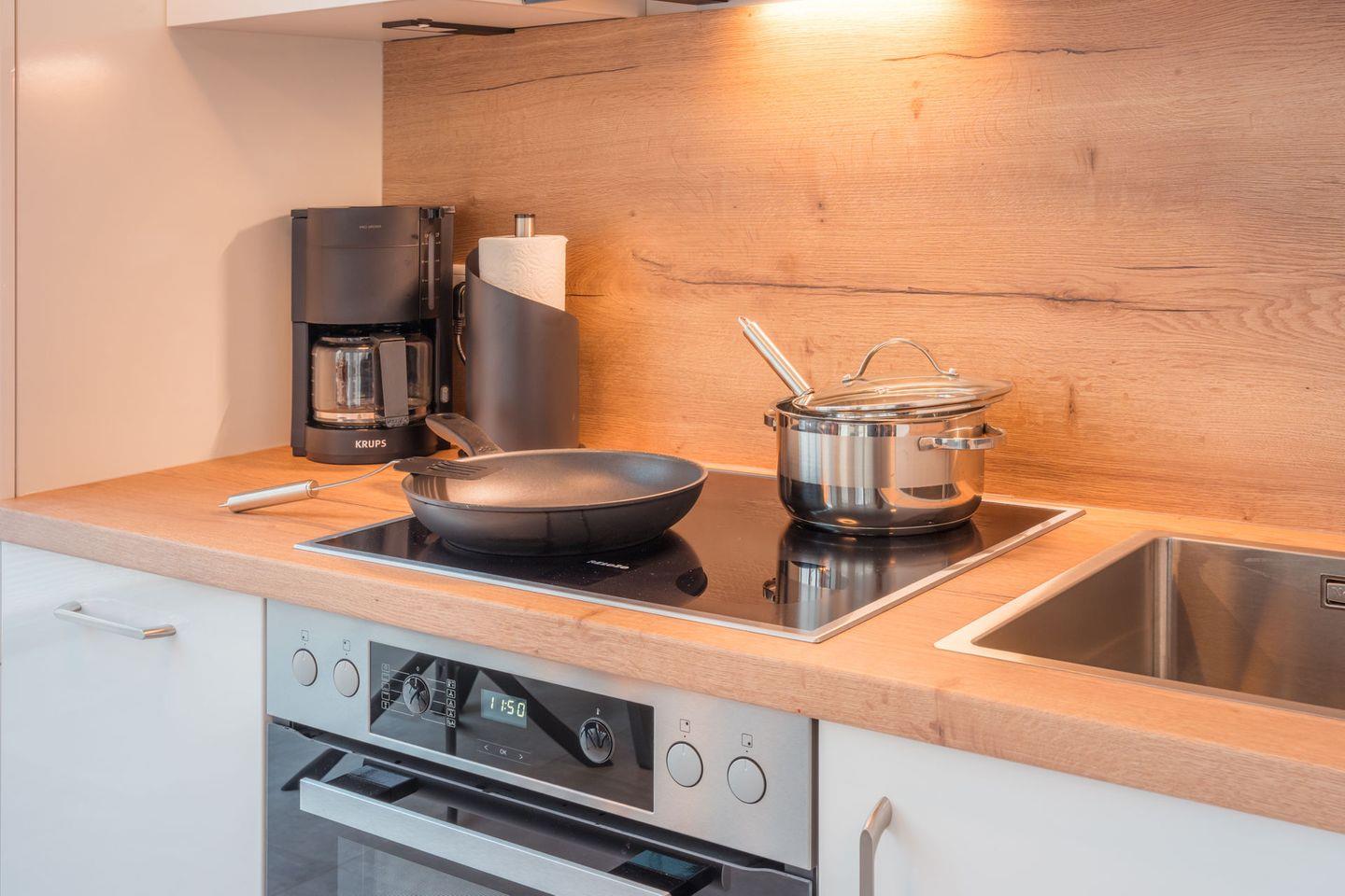 Die offene, vollausgestattete Küche ist ein weiteres Highlight dieser Unterkunft. Hier finden Sie alles, was Sie zum Zubereiten Ihrer Lieblingsgerichte benötigen: von einem modernen Cerankochfeld über einen Backofen und eine Spülmaschine bis hin zu einer Kaffeemaschine und einem Kühlschrank mit Gefrierfach. Die Küchenutensilien sind ebenfalls vorhanden, sodass Ihnen an nichts fehlen wird.