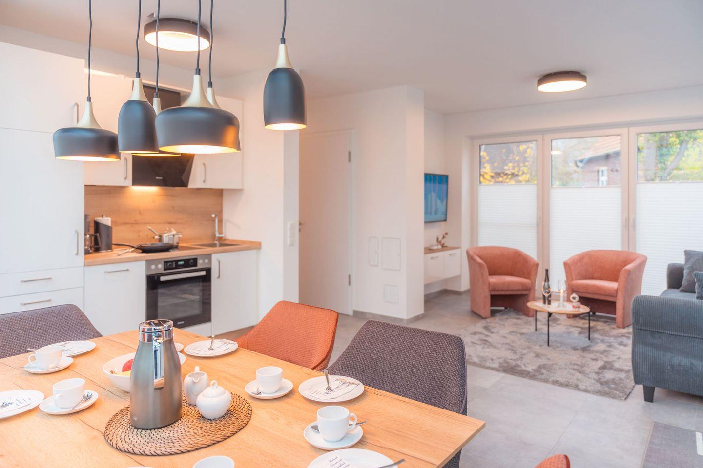 Küche und Haushalt: Einbauküche, Kühlschrank mit Gefrierfach, 4-Zonen Cerankochfeld, Backofen, Dunstabzugshaube, Geschirrspüler, Filterkaffeemaschine, Toaster, Wasserkocher, hochwertiges Geschirr und Besteck