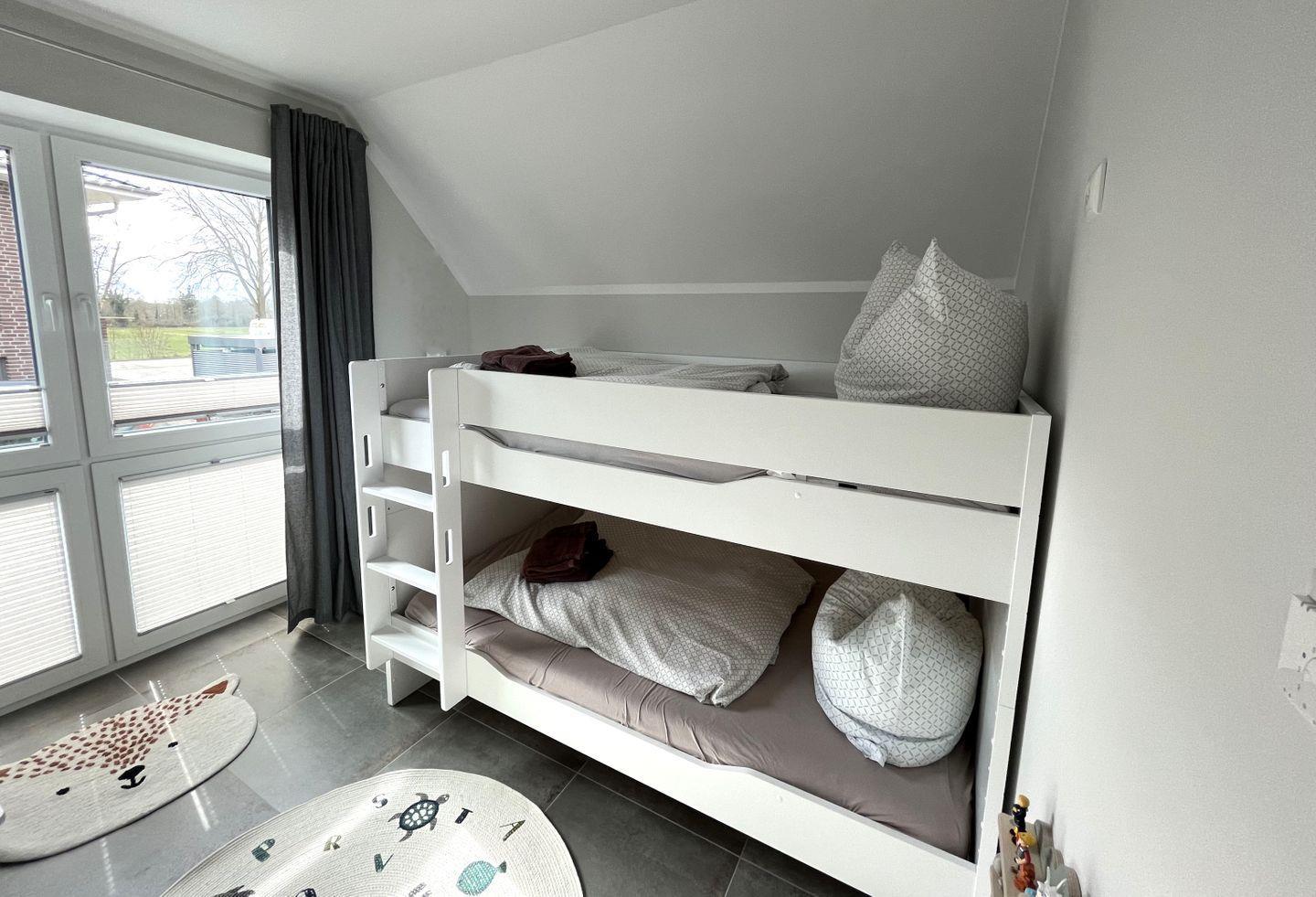 Schlafzimmer 3: extrabreites Etagenbett ( 2 Einzelmatratzen 120x200 cm), Wickelkommode, Kleiderschrank, Toniebox mit 8 Tonies, Verdunkelungsvorhänge