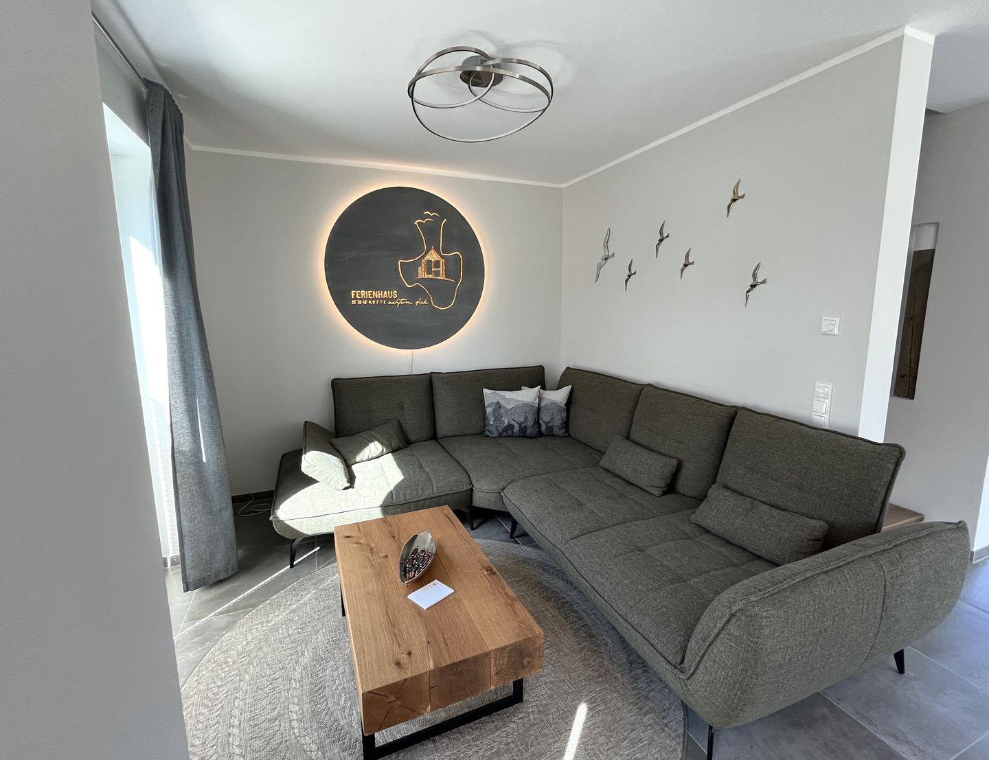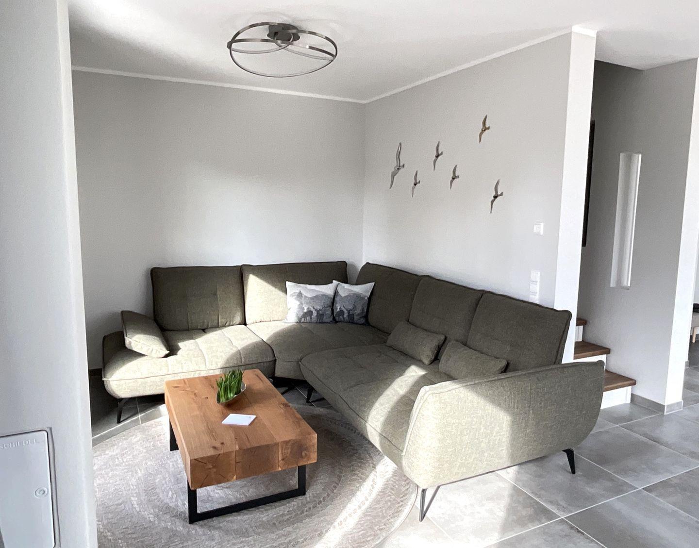 Wohn-Esszimmer: große gemütliche Eckcouch, Flachbildfernseher (Smart TV), Empfang deutschsprachiger TV-Programme (SAT-Anlage), großer Esstisch mit 6 Stühlen als Mittelpunkt im Erdgeschoss