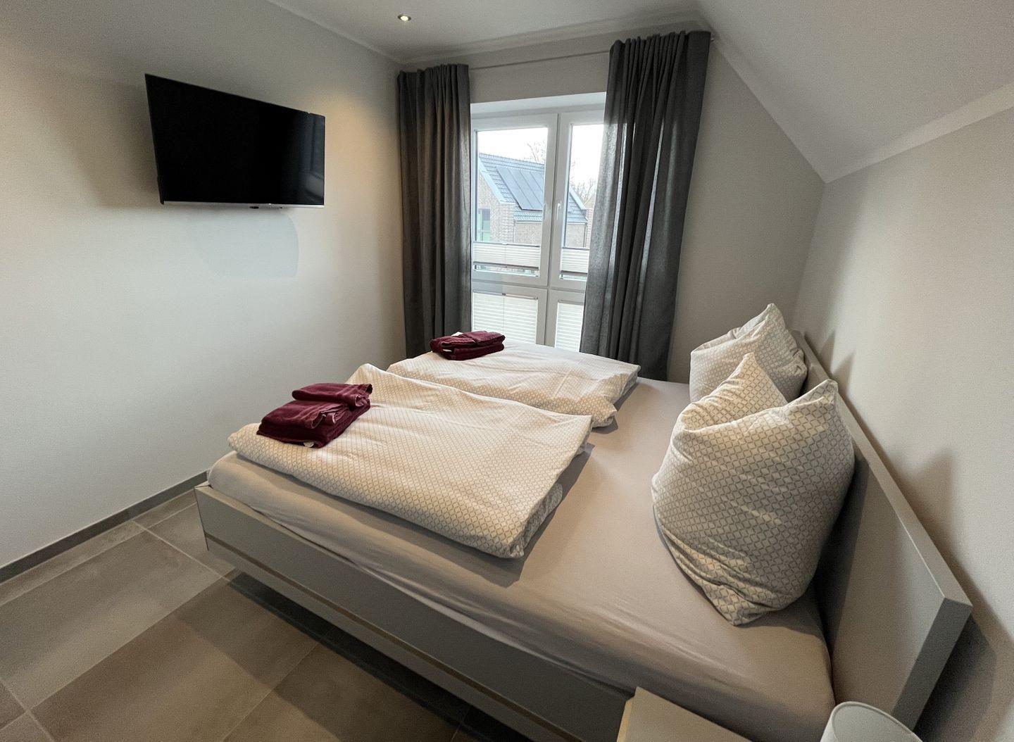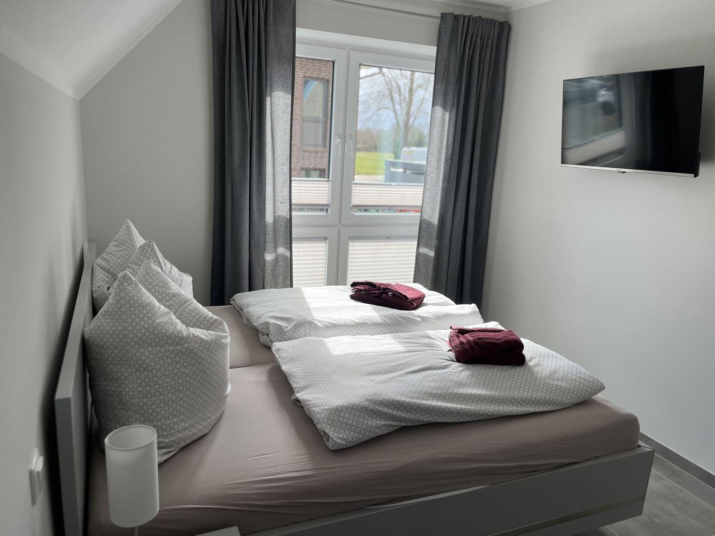 Schlafzimmer 2: Doppelbett (Maße: 180 x 200 cm, 2 Einzelmatratzen 90x200 cm), Nachttische, Kleiderschrank, Flachbildfernseher (Smart TV), Verdunkelungsvorhänge