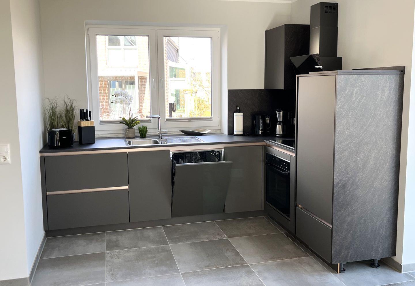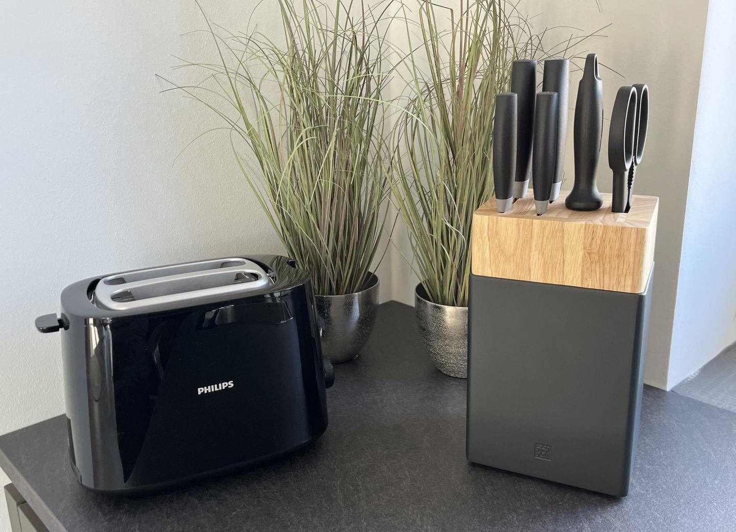 Küche und Haushalt: Einbauküche, Kühlschrank mit Gefrierfach, 4-Zonen Cerankochfeld, Backofen, Mikrowelle, Dunstabzugshaube, Geschirrspüler, Kaffeefiltermaschine, Cafissimo Kaffee-Kapselmaschine, Toaster, Wasserkocher, hochwertiges Geschirr und Besteck, Schneidebretter.