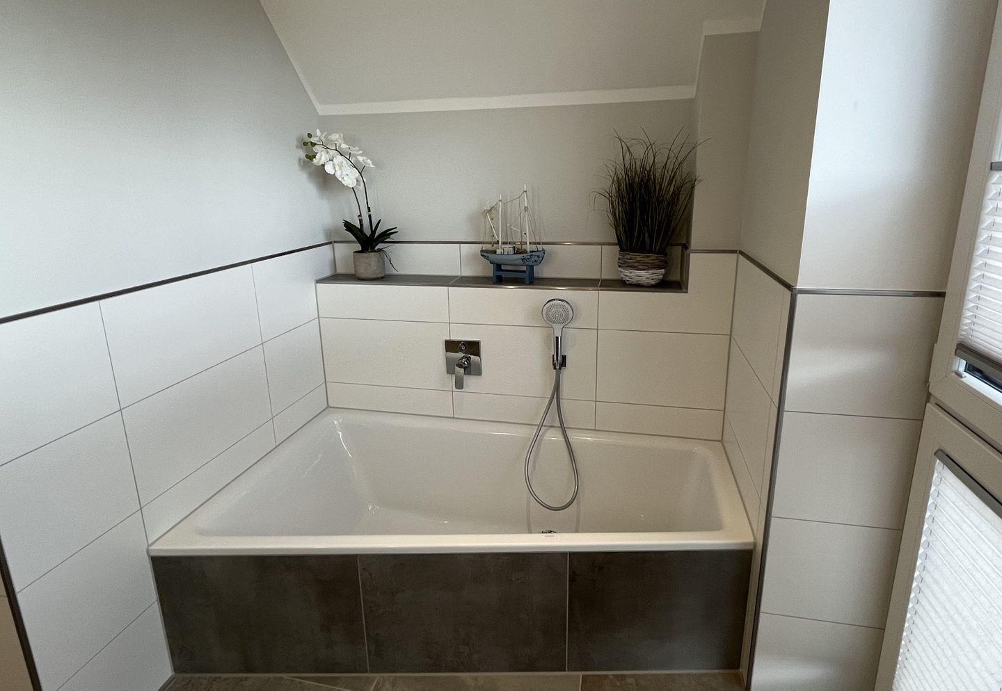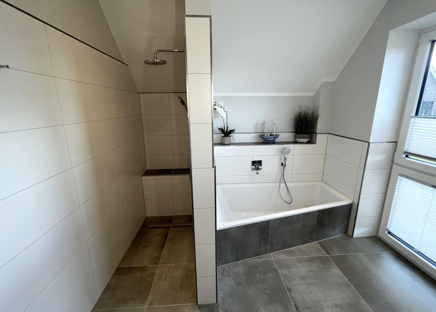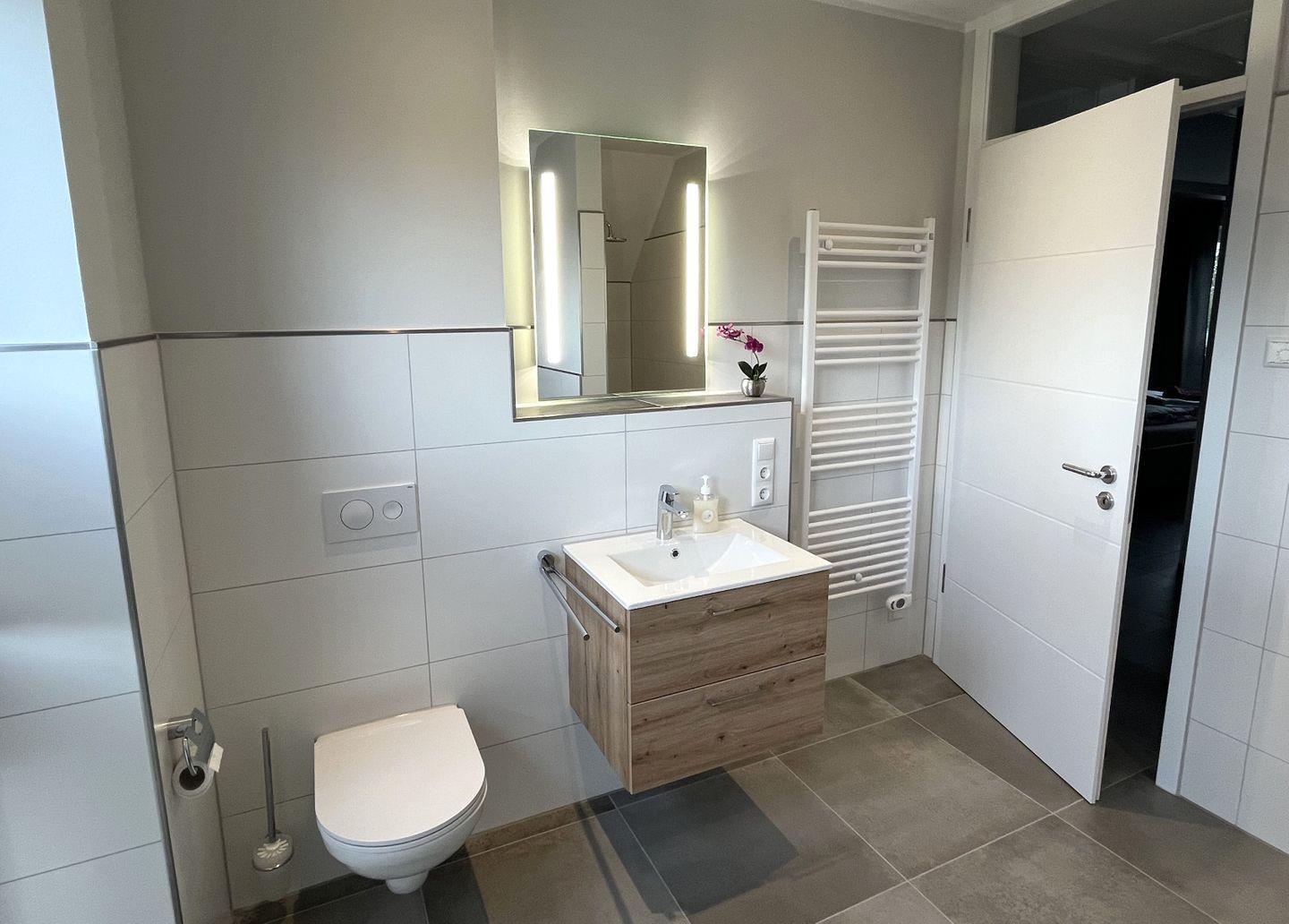 Bad und Sanitär im 1. OG: bodentiefe, barrierefreie Sommerregendusche, Badewanne, Waschtischanlage mit Spiegel, WC, Handtuchheizung, Föhn, Handtücher auf Anfrage
