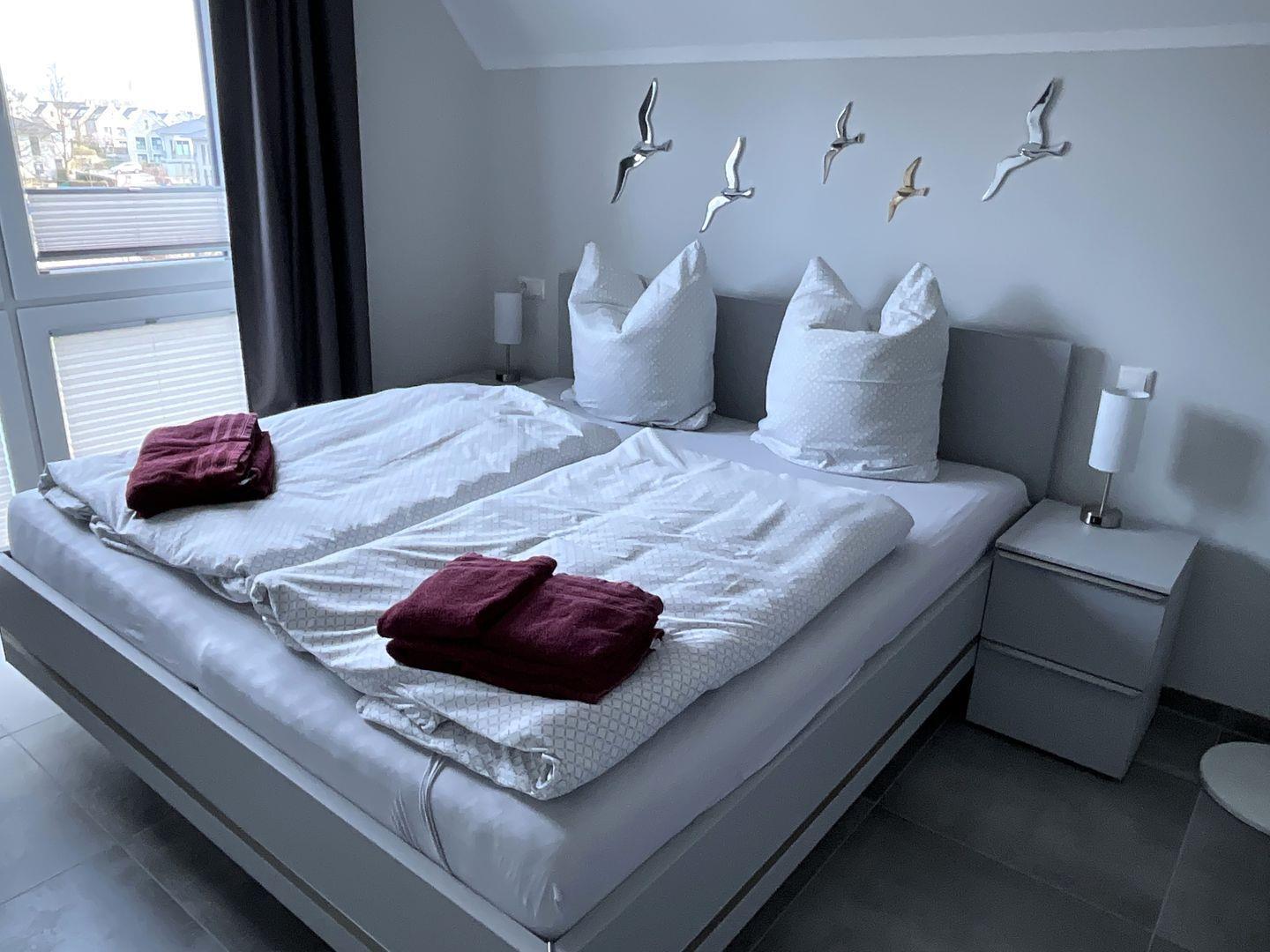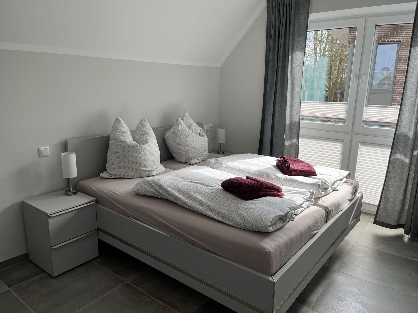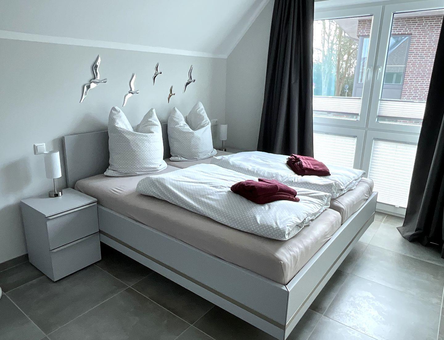 Schlafzimmer 1: Doppelbett (Maße: 180 x 200 cm, 2 Einzelmatratzen 90x200 cm), Nachttische, Kleiderschrank, Flachbildfernseher (Smart TV), Verdunkelungsvorhänge