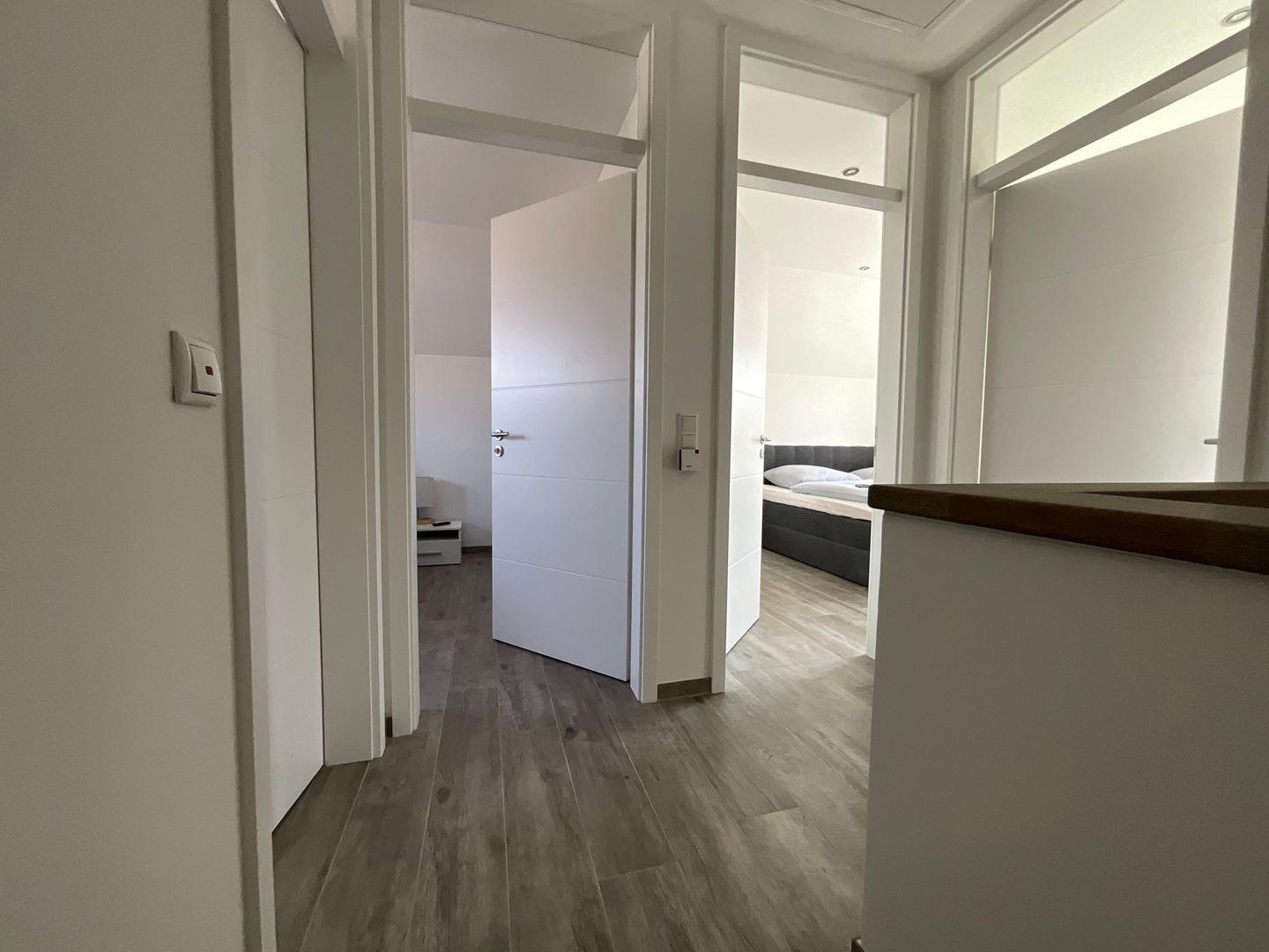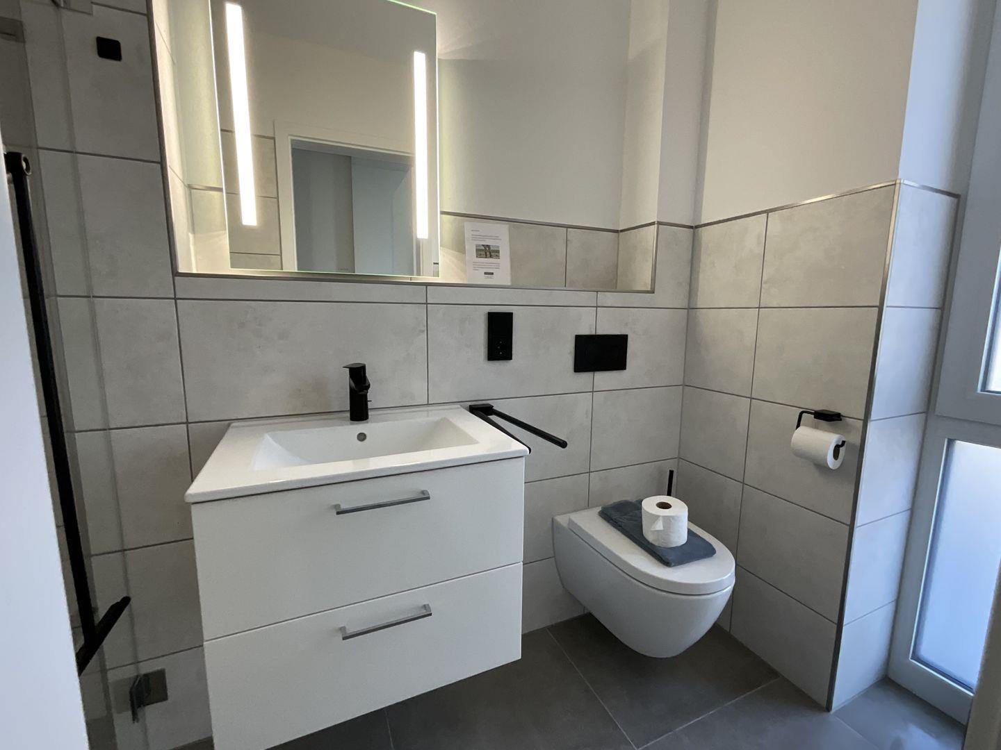 Bad und Sanitär im 1. OG: bodentiefe, barrierefreie Sommerregendusche, Badewanne, Waschtischanlage mit Spiegel, WC, Handtuchheizung, Föhn, Handtücher auf Anfrage