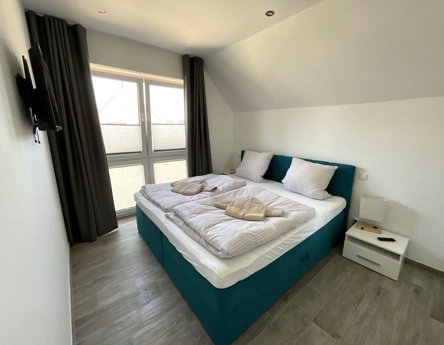Schlafzimmer 2: Doppel-Boxspringbett (Maße: 200 x 200 cm, 1 Matratze), Nachttische, Kleiderschrank, Flachbildfernseher (Smart TV), Verdunkelungsvorhänge