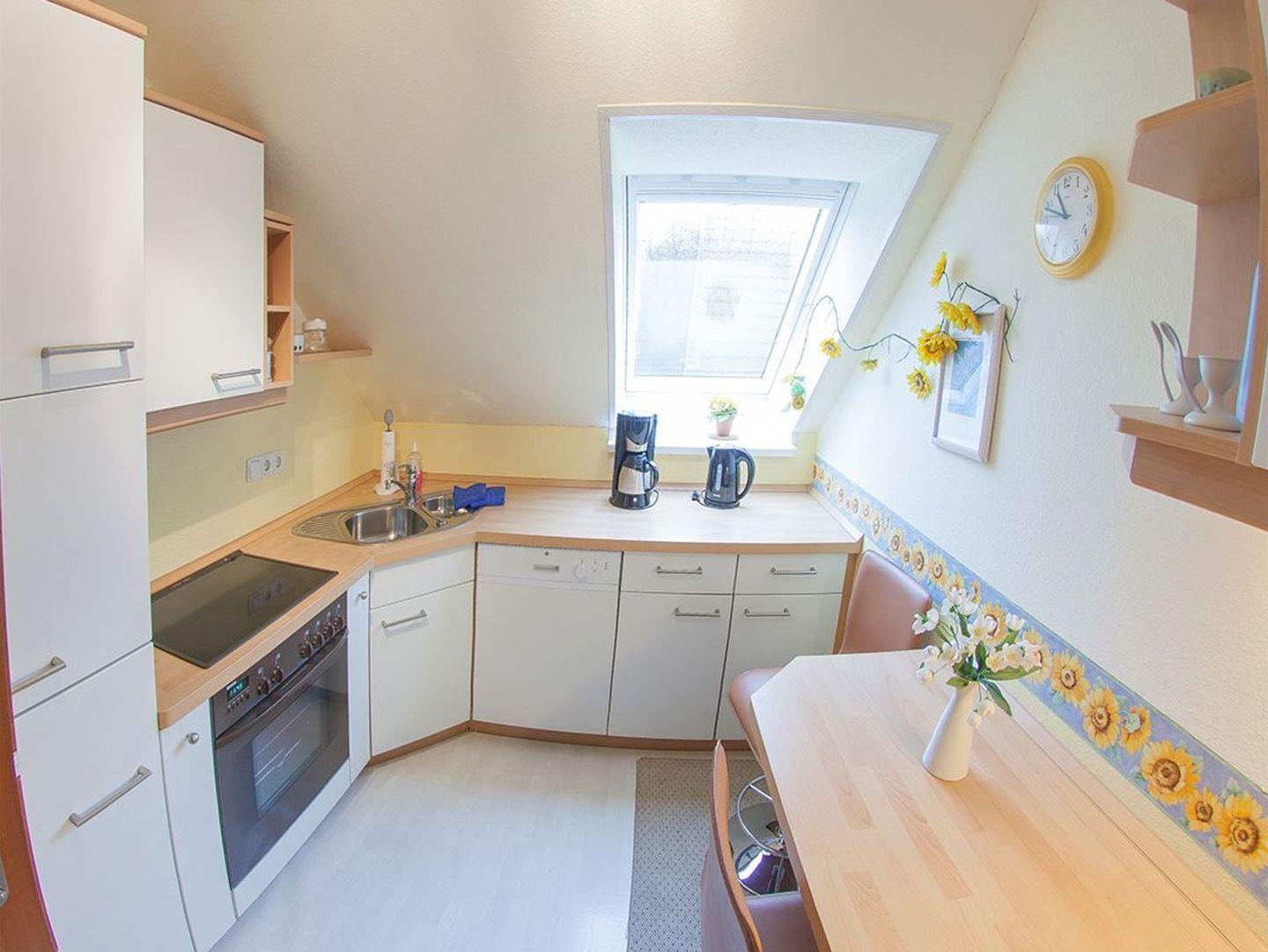 Die voll ausgestattete, abgeschlossene Küche lässt keine Wünsche offen: Neben einem Herd mit vier Kochplatten, einem kleinen Kühlschrank mit Gefrierfach und einem Backofen finden Sie dort auch eine Mikrowelle, eine Spülmaschine sowie eine Kaffeemaschine. Alle notwendigen Küchenutensilien, Geschirr und Besteck sind ebenfalls vorhanden, sodass Sie Ihre kulinarischen Fähigkeiten voll ausspielen können.