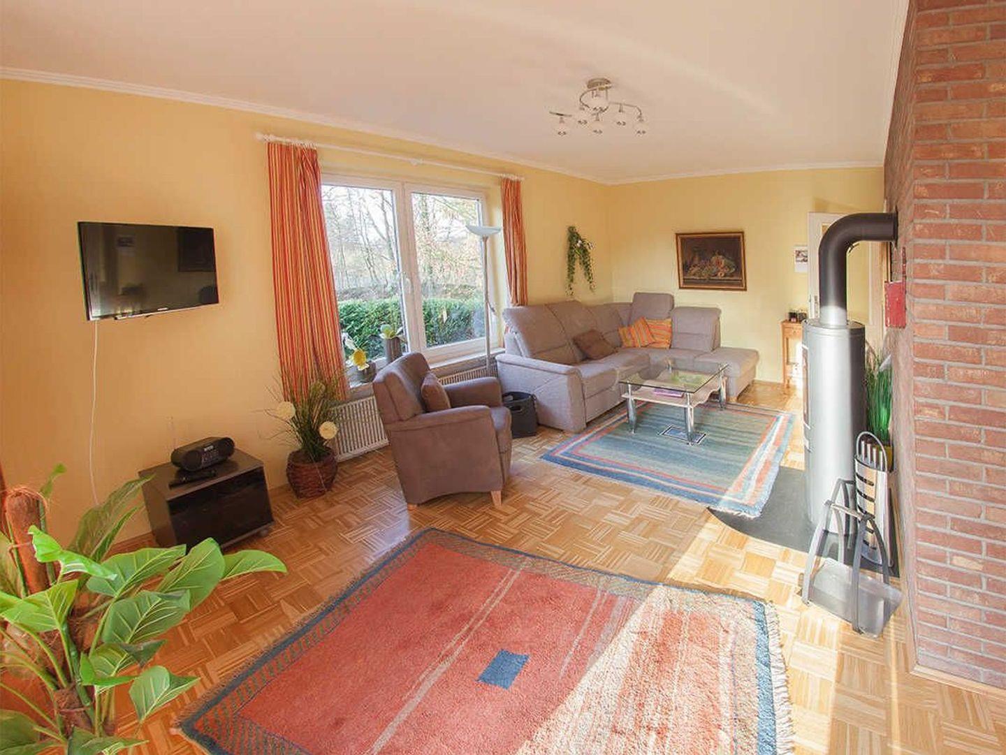 Durch den geräumigen Flur mit Garderobe und Gäste-WC gelangen Sie in den offenen Wohnbereich, der sich harmonisch anschließt an den Essplatz mit Küchenzeile. Getrennt durch eine Klinkerwand ist der Raum in U-Form gestaltet und vermittelt ein angenehmes Raumgefühl. Hier geht es auch hinaus auf die Süd-Terrasse. Der große Garten bietet ein Gartenhaus nebst Brunnen und Kamingrill.