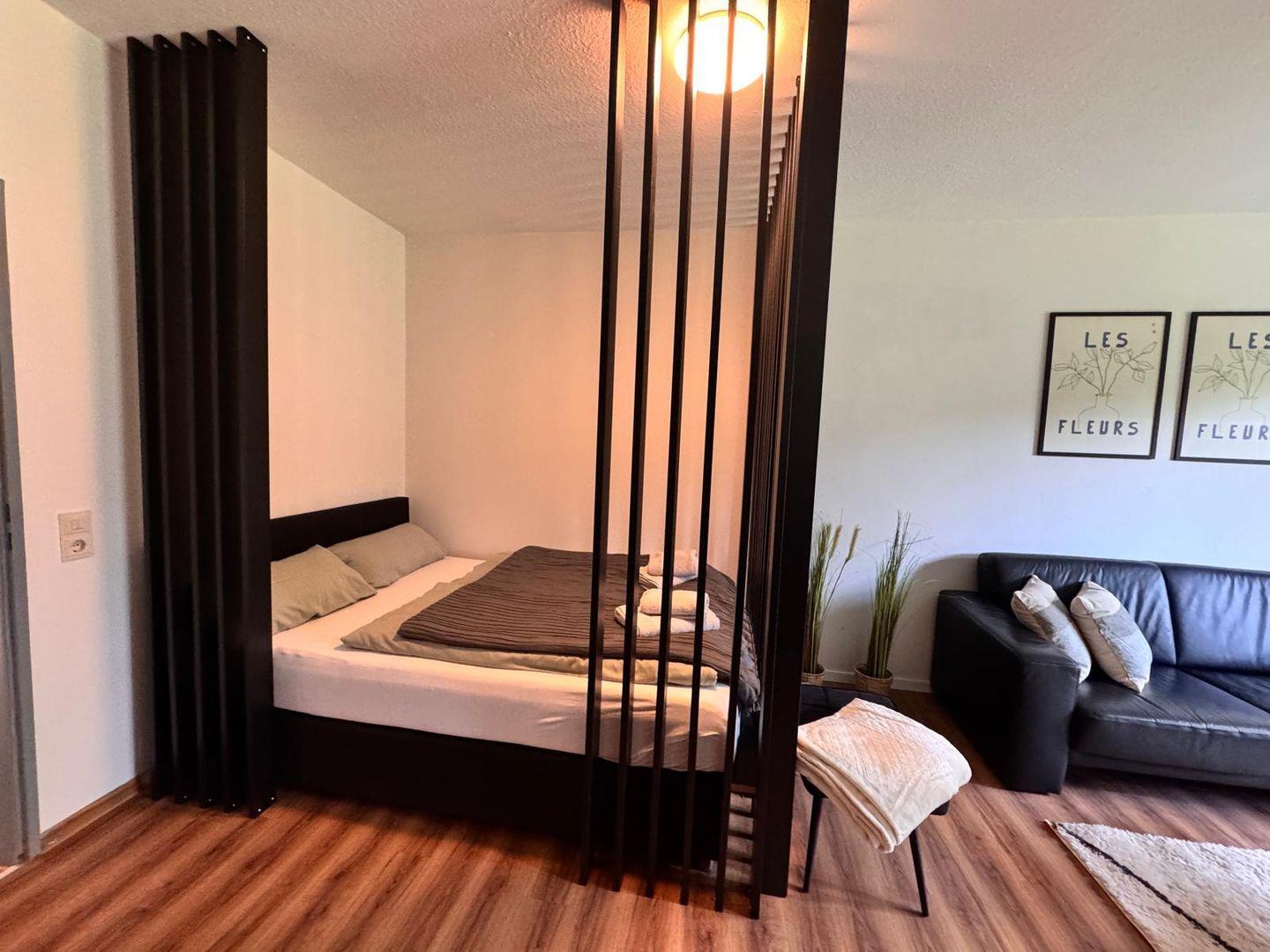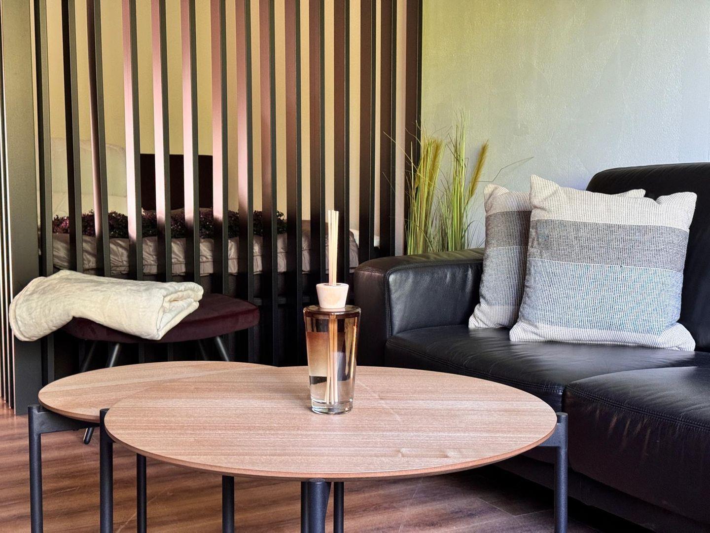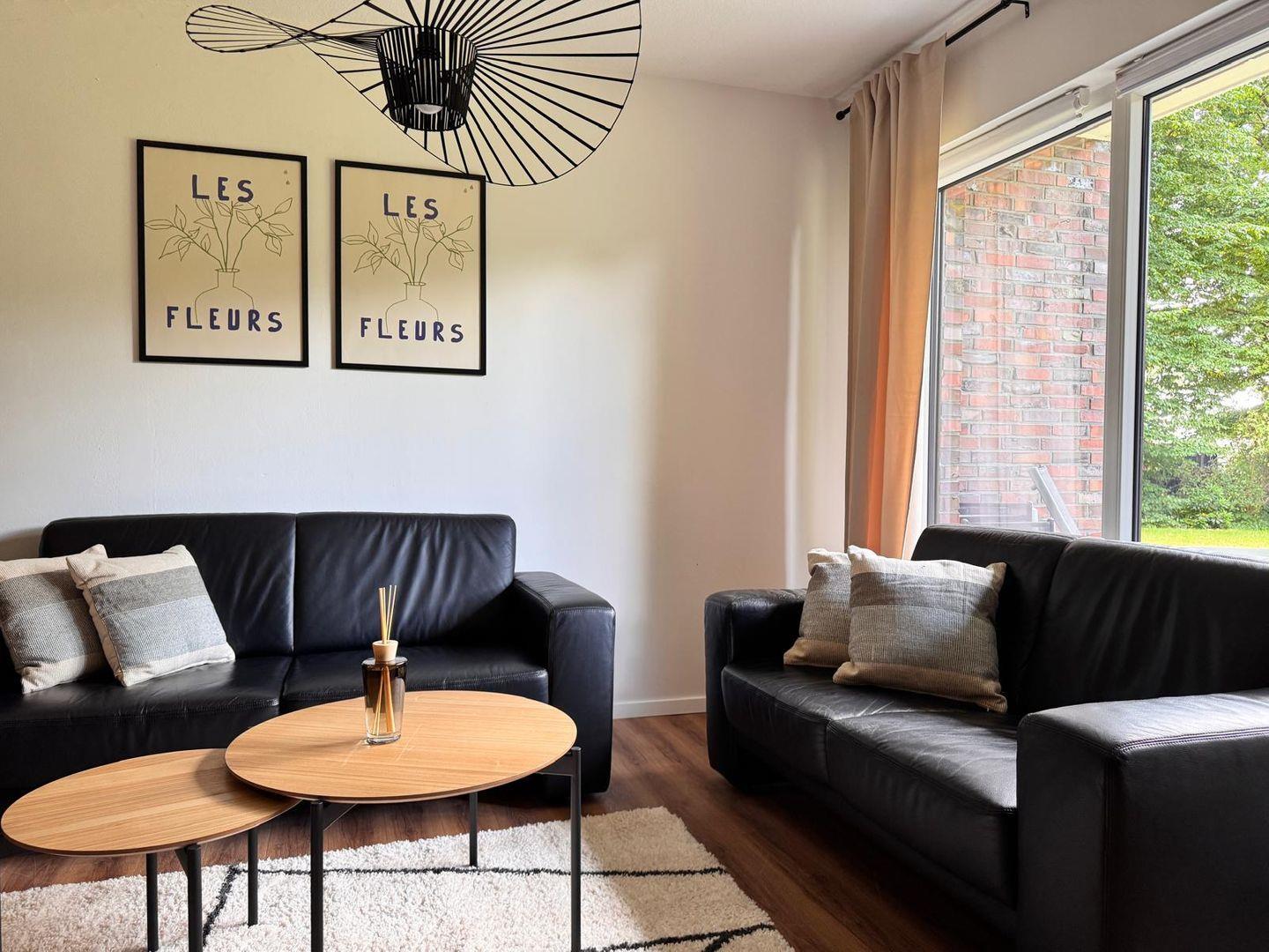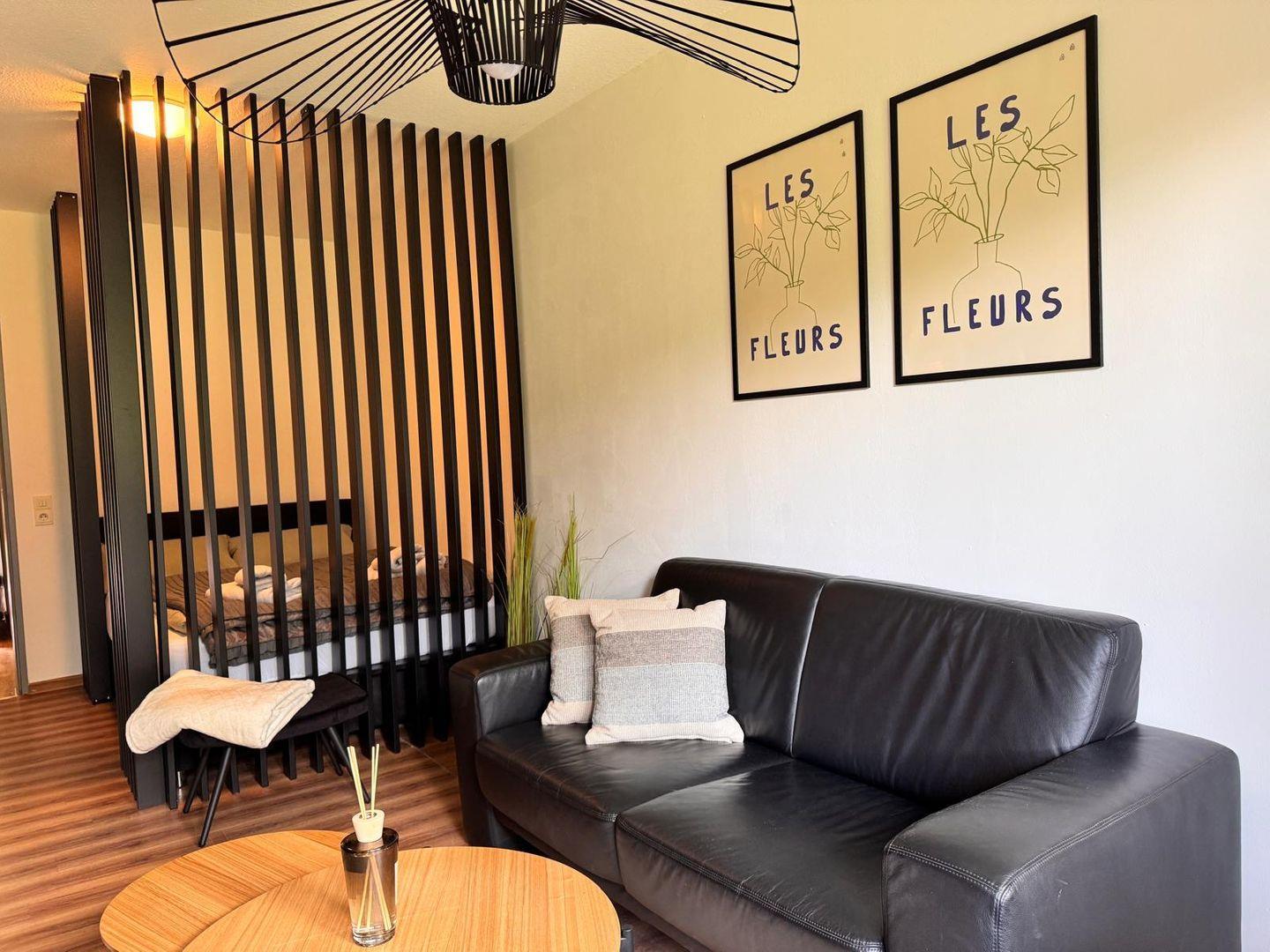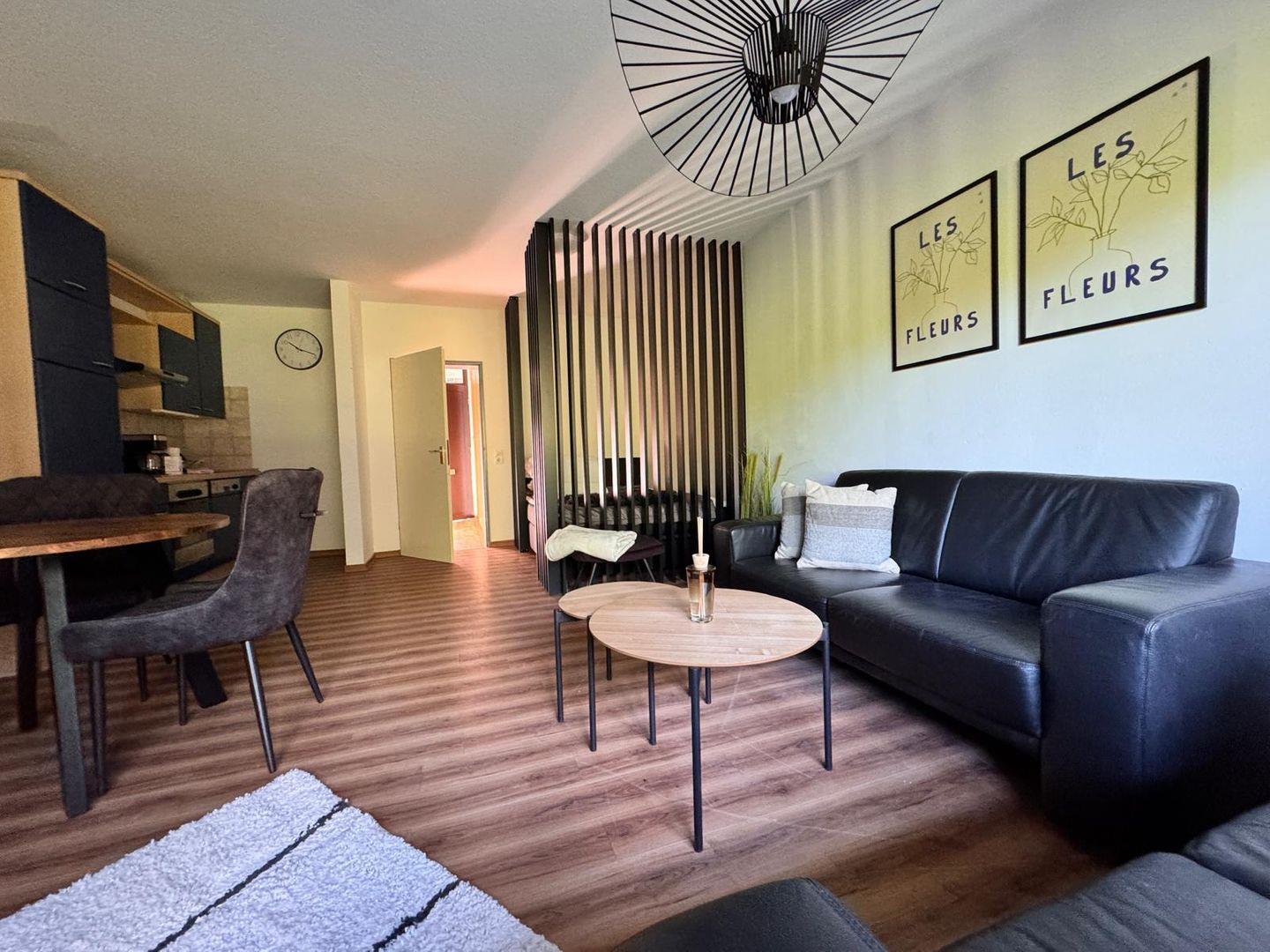 Der wohnliche Bereich verfügt über zwei bequeme Sofa aus Leder, einen TV und kostenlosen WLAN-Zugang, sodass gemütliche Abende und Unterhaltung garantiert sind. Der Laminatboden im Wohnraum sorgt nicht nur für ein gepflegtes Ambiente, sondern erleichtert auch die Reinigung, insbesondere wenn Sie mit Kind oder Haustier reisen.