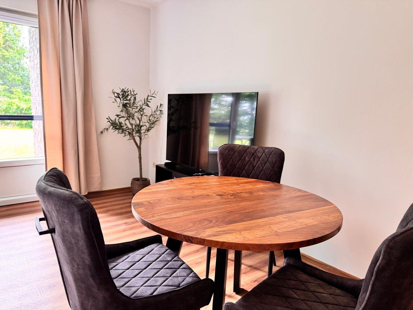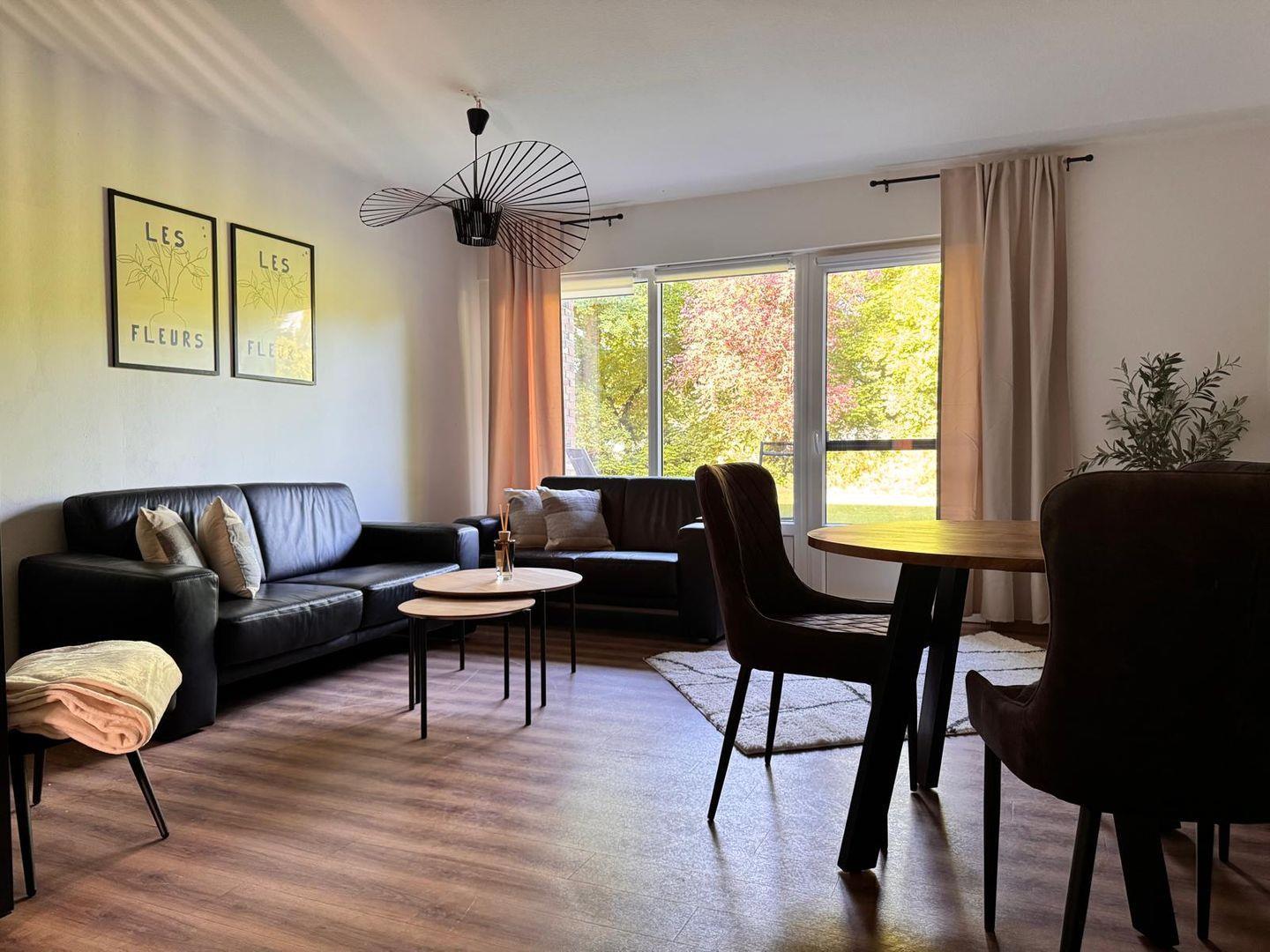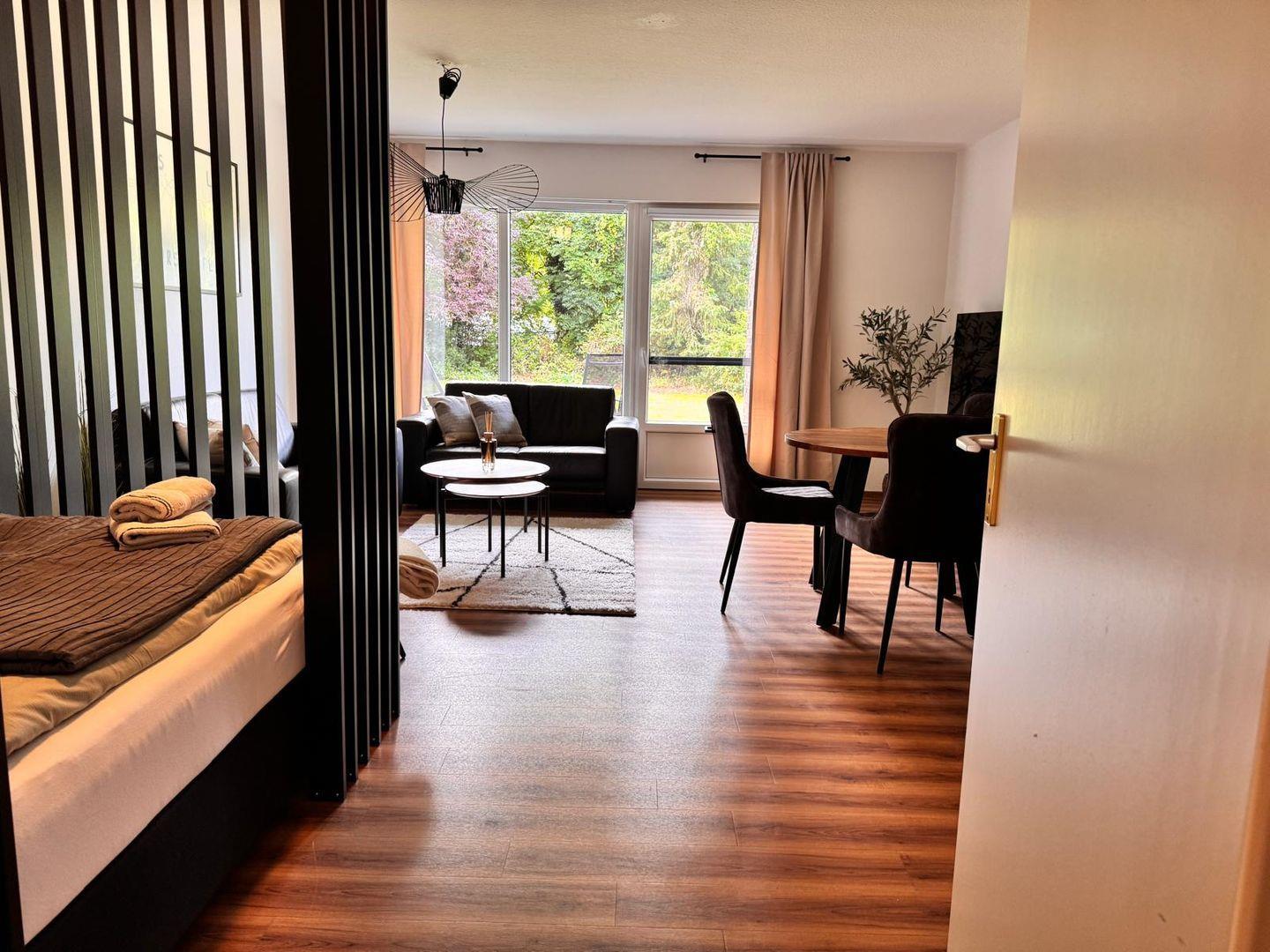 Freuen Sie sich auf eine offen gestaltete Küche mit Geschirrspüler, einen Wohnbereich mit TV und WLAN sowie eine Terrasse mit Gartenblick.