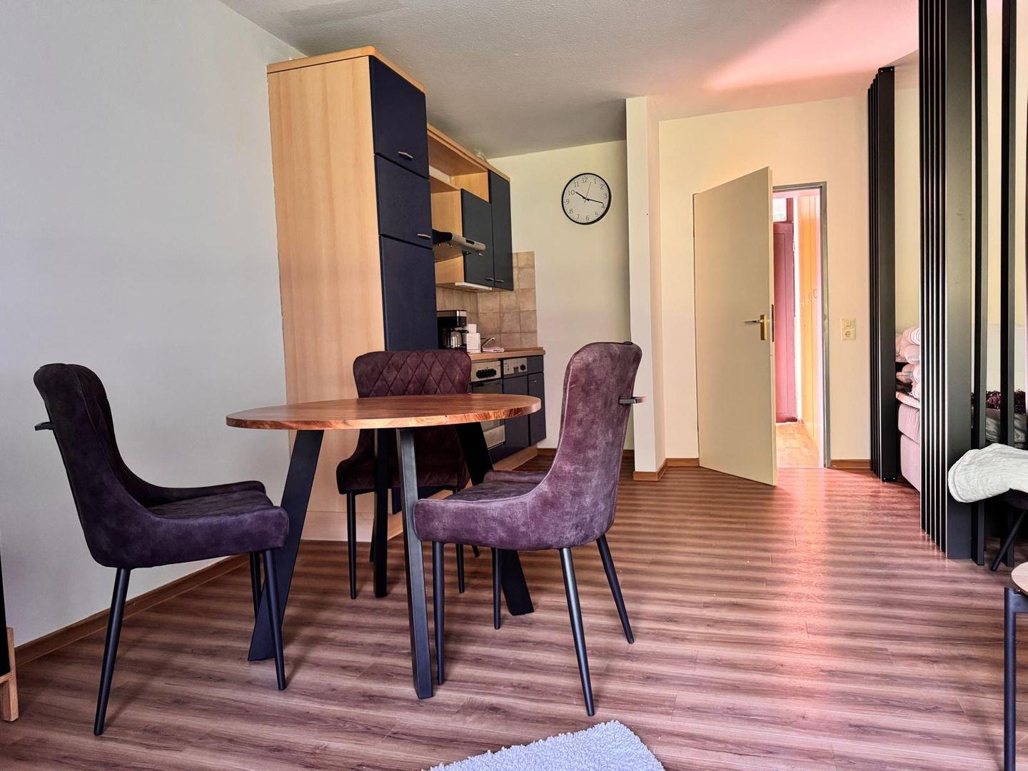 Die offene Küche (Küchenzeile) zum Wohnzimmer ist vollständig ausgestattet und überzeugt mit modernen Geräten: Hier stehen Ihnen ein Ceranherd, ein Backofen, ein Kühlschrank sowie eine Spülmaschine zur Verfügung. Ergänzt wird die Küchenausstattung um Küchenutensilien, Geschirr, Besteck, Kaffeemaschine, Toaster und Wasserkocher – somit lassen sich alle Mahlzeiten unkompliziert zubereiten. Ein eigener Essbereich mit Esstisch bietet Platz für gemütliche Stunden beim Frühstück oder Abendessen.