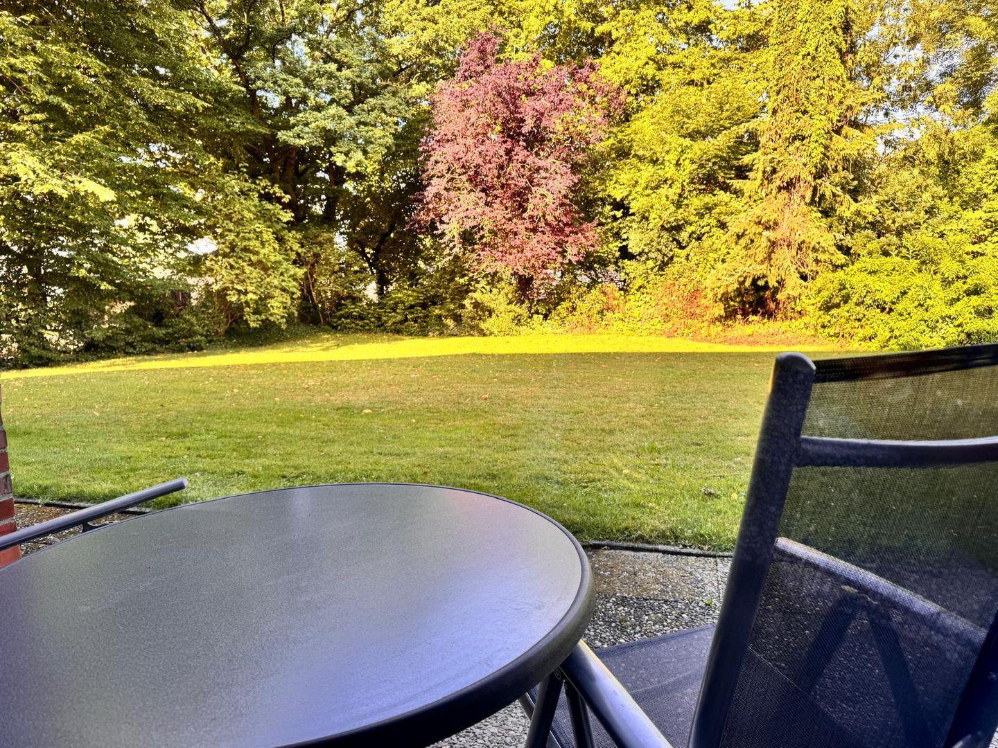 Ein weiteres Highlight ist die eigene Terrasse, die mit Gartenmöbeln ausgestattet ist und einen direkten Blick in den Garten eröffnet. Die Liegewiese ergänzt den Außenbereich ideal zum Entspannen an sonnigen Tagen. Der gepflegte Garten schafft eine behagliche Atmosphäre für Ruhe und Erholung. Der Privatparkplatz am Haus ist für Sie kostenlos und bequem erreichbar; es steht ein eigener Parkplatz zur Verfügung.