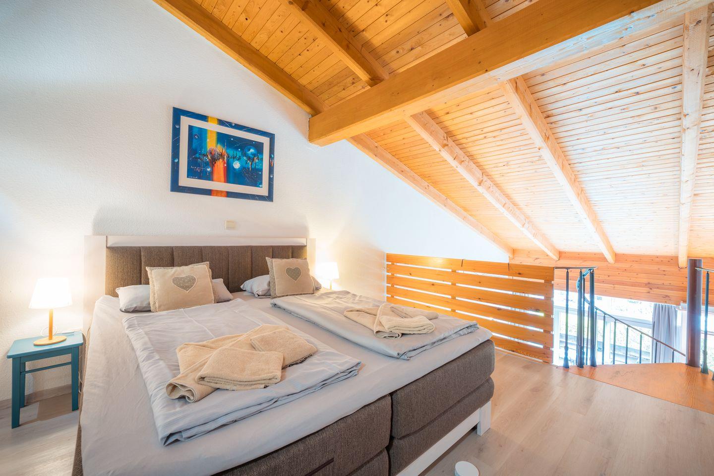 Das Apartment verfügt über einen Schlafbereich auf einer offenen Galerie mit einem großen Boxspringbett (180 x 200 cm - eine durchgängige Matratze) und der Möglichkeit ein separates Klappbett aufzustellen.