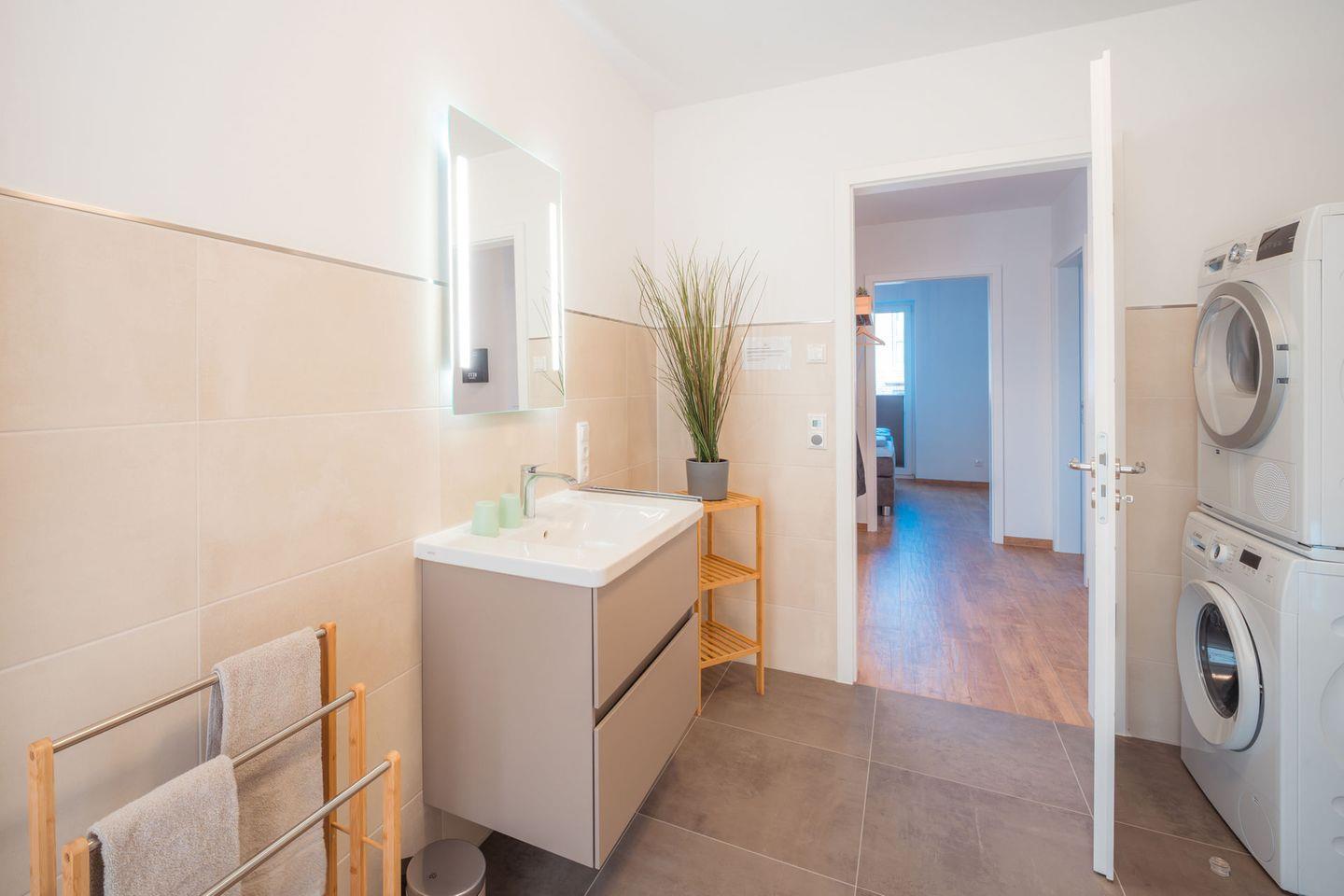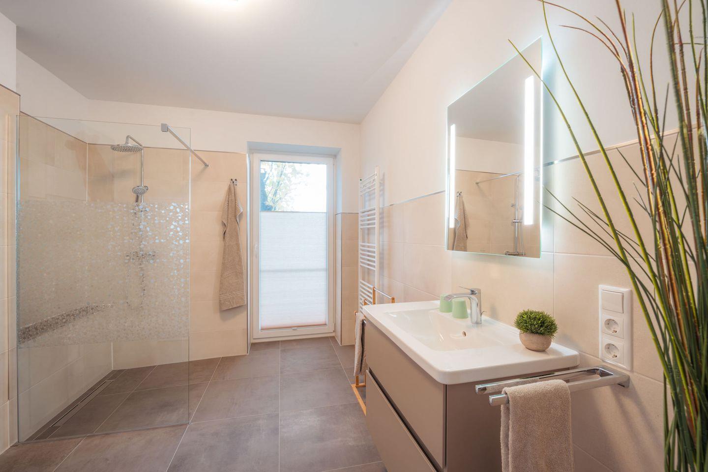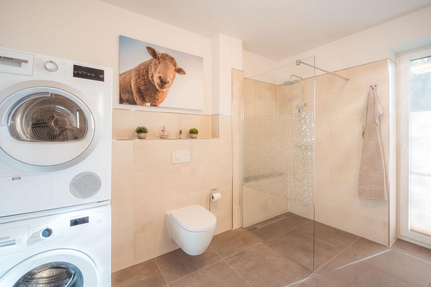 Duschbad : bodentiefe, barrierefreie Regendusche, Waschtischanlage mit Spiegel, Abstellflächen, WC, Waschmaschine + Trockner
