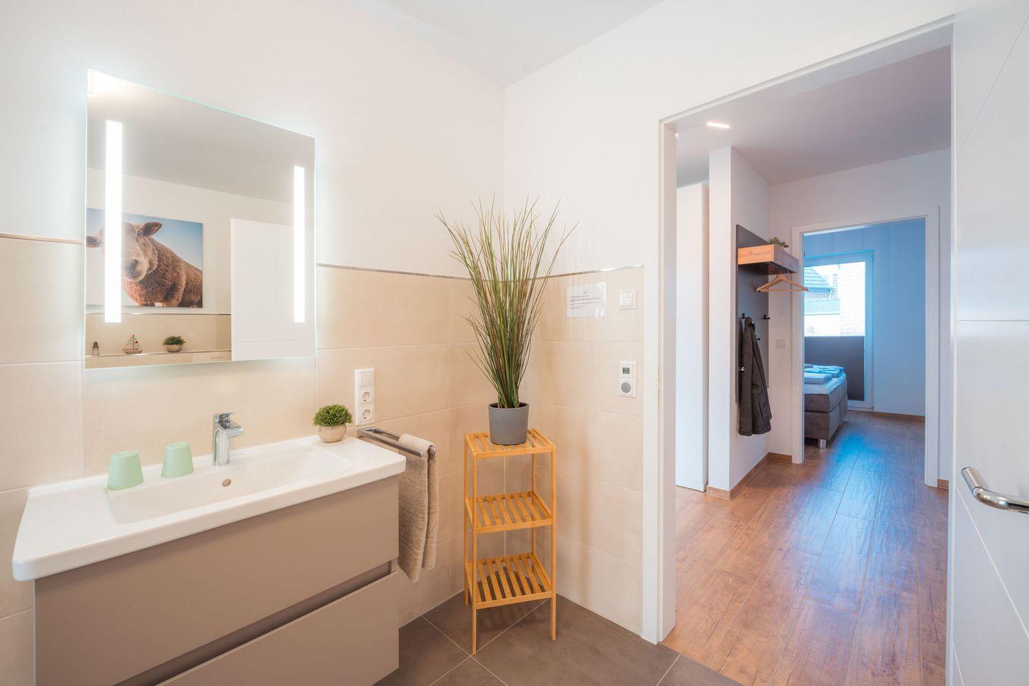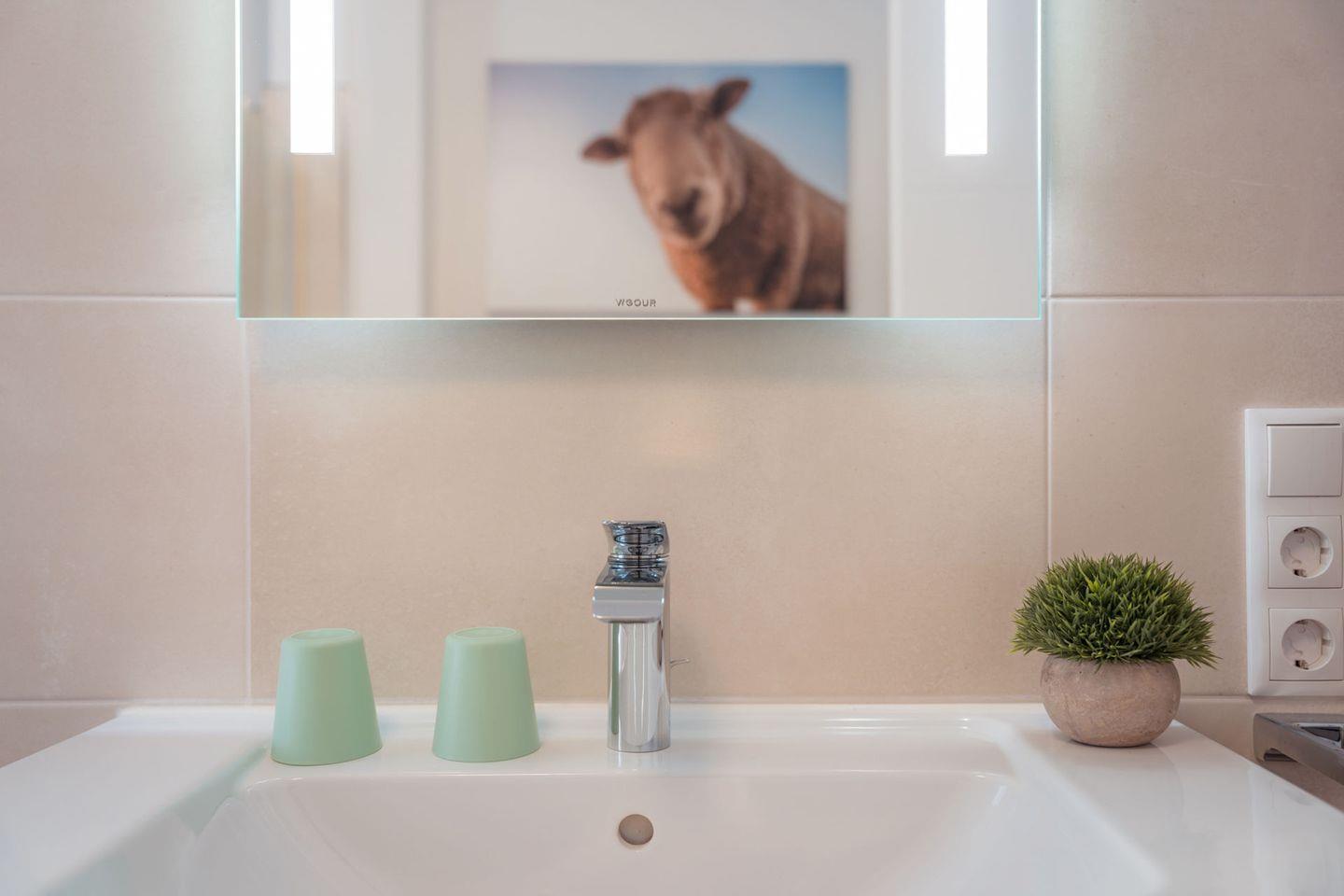 Das Watt'n Wunder verfügt über drei Zimmer, darunter zwei separate Schlafzimmer mit insgesamt vier Schlafmöglichkeiten. Der Bodenbelag aus Fliesen in Wohn- und Schlafzimmern – inkl. Fliegengittern an den Fenstern und Sichtschutz für alle Fenster – gewährleisten ein angenehmes Raumklima und bieten ideale Bedingungen für Allergiker. Die Grundausstattung schließt einen Wohnbereich mit Sofaecke, Essbereich und moderner offener Küche ein, deren Ausstattung auch für anspruchsvolles Kochen bestens geeignet ist: Zur Verfügung stehen Ihnen ein Ceranherd mit Elektrobackofen, Kühlschrank mit Gefrierfach, Spülmaschine, Wasserkocher, Toaster, Kaffeemaschine sowie umfangreiches Geschirr, Besteck und Küchenutensilien. Das Tageslicht-Bad ist mit bodengleicher Dusche, hochwertigem Waschbecken, Spiegel ausgestattet.
