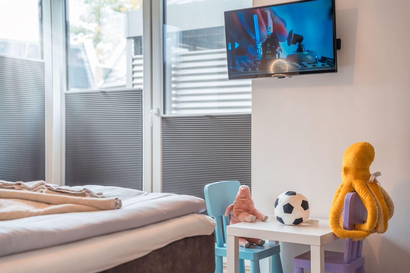 Schlafzimmer 2: Doppelbett (Maße: 180 x 200 cm- durchgängige Matratze), Nachttische, Leselampen, Kleiderschrank, Smart-TV, verdunkelnde Plissees