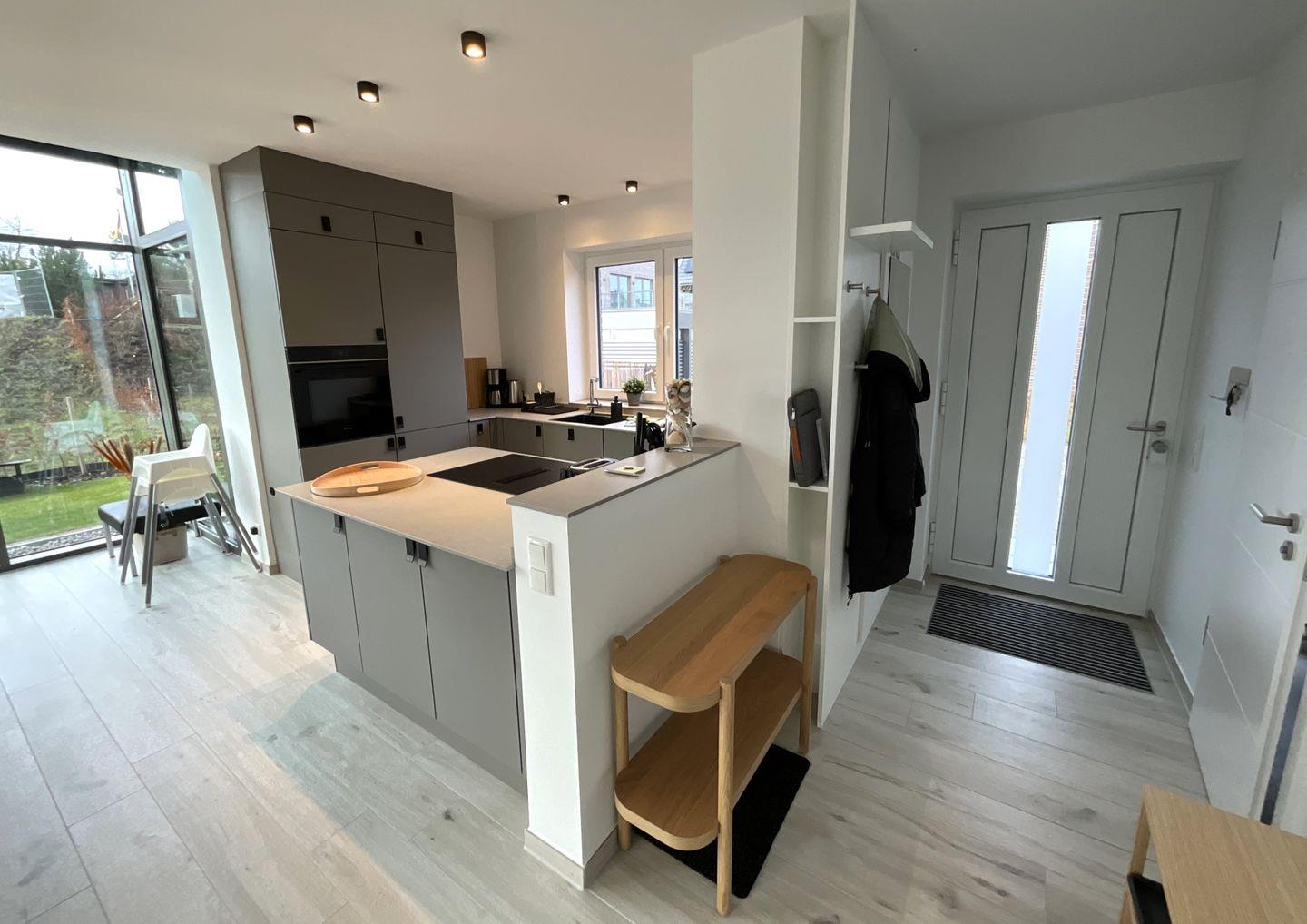 Küche und Haushalt: Einbauküche, Kühlschrank mit Gefrierfach, 4-Zonen Cerankochfeld mit integriertem Dunstabzug, Backofen mit integrierter Mikrowelle, Geschirrspüler, Kaffeefiltermaschine, Nespresso Espressomaschine, Toaster, Wasserkocher, hochwertiges Geschirr und Besteck.