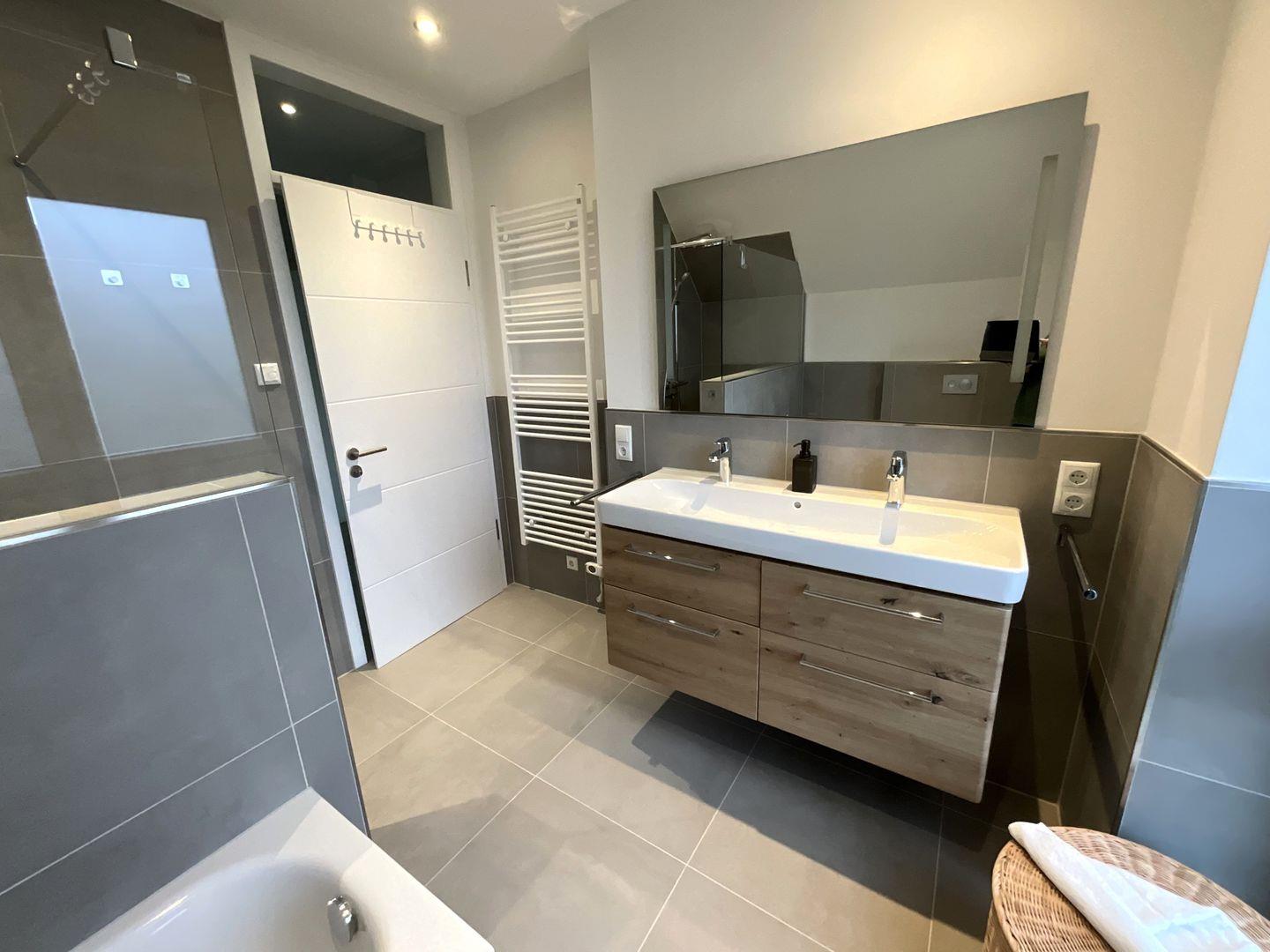 Das Haus verfügt über zwei komfortable Badezimmer: Ein Bad ist mit einer bodengleichen Dusche, Waschbecken, WC, Fenster und Spiegel ausgestattet, das andere zusätzlich mit einer Badewanne. Warme Füße garantiert die Fußbodenheizung, die im gesamten Haus für wohlige Temperaturen sorgt. Ein Ganzkörperspiegel, Haartrockner, Waschmaschine zur Eigennutzung runden das Angebot ab.