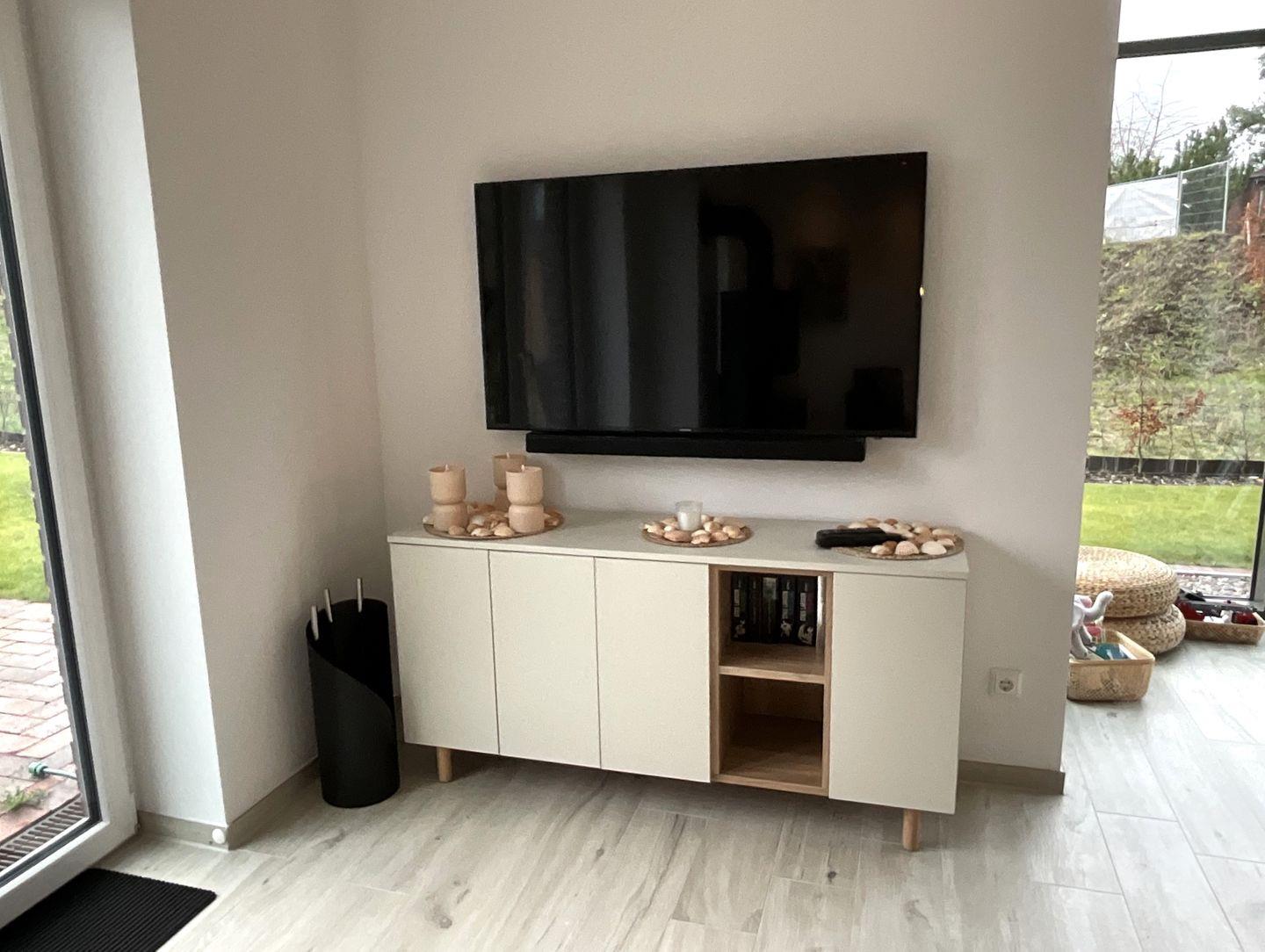 Wohn-Esszimmer: Couch mit gemütlichem Sessel, Flachbildfernseher (Smart TV), Empfang deutschsprachiger TV-Programme (SAT-Anlage), großer Esstisch mit 6 Stühlen als Mittelpunkt im Erdgeschoss, Sicht/- Sonnenschutz im Wintergarten