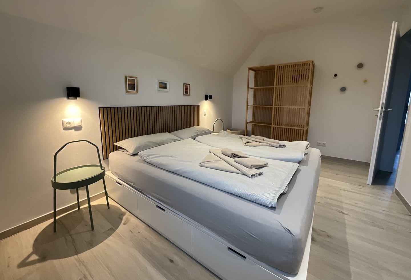 Schlafzimmer 1: Doppelbett (Maße: 180 x 200 cm, eine durchgängige Matratze), Nachttische, offener Kleiderschrank / Regal, Wickelmöglichkeit, Verdunkelungs-Plissees, Verdunkelungsvorhänge