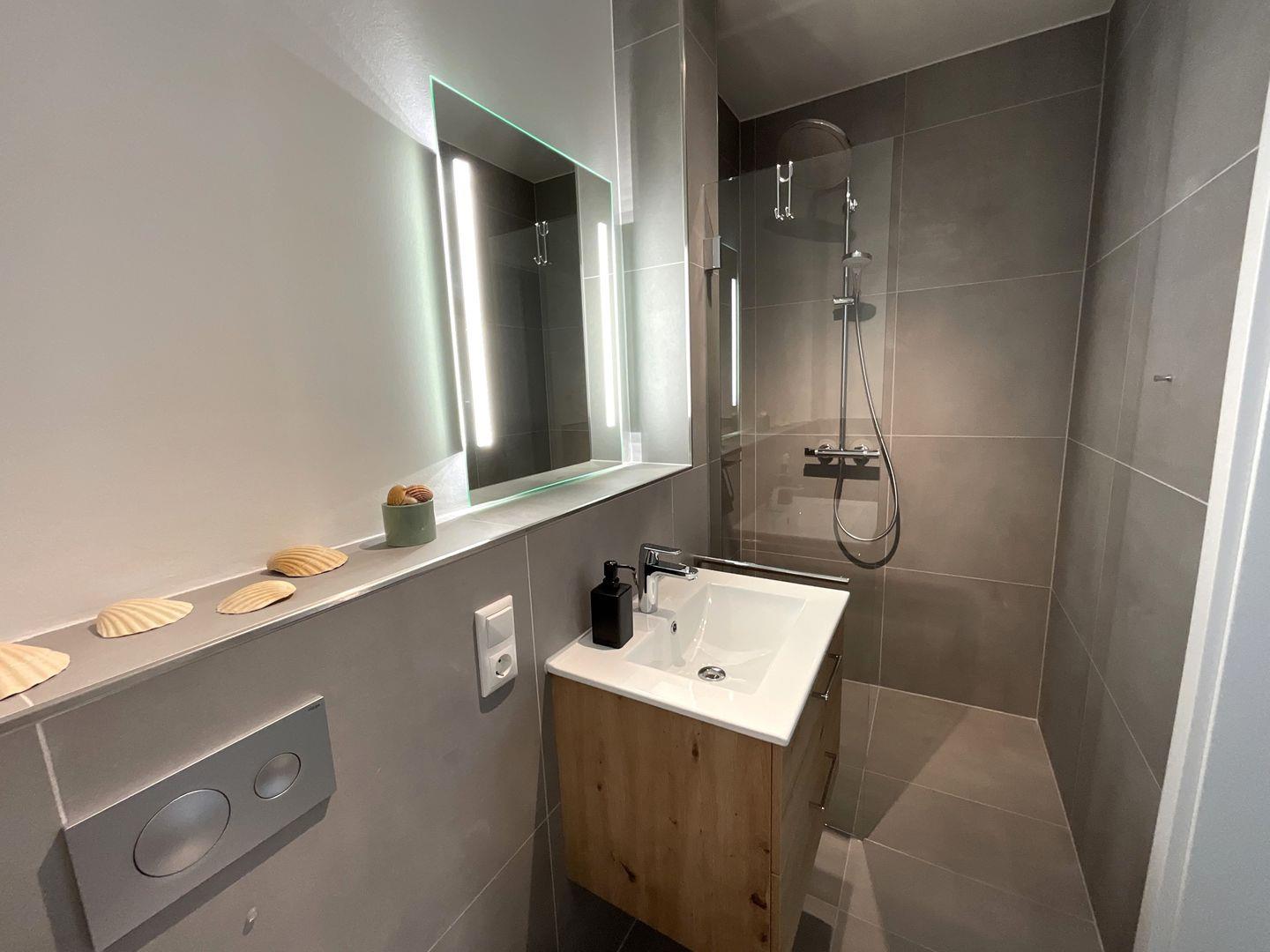 Bad und Sanitär im 1. OG: bodentiefe, barrierefreie Sommerregendusche, Badewanne, Waschtischanlage mit Spiegel, WC, Handtuchheizung, Föhn, Handtücher auf Anfrage