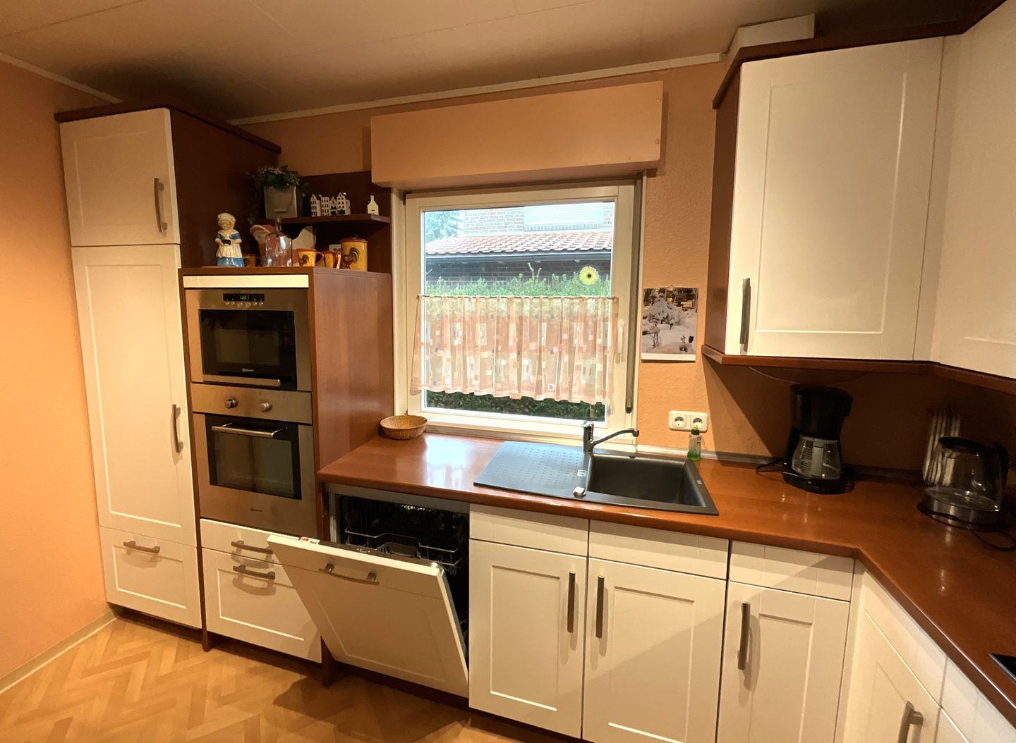 Küche und Haushalt: Einbauküche, Kühlschrank mit Gefrierfach, 4-Zonen Cerankochfeld, Backofen, Mikrowelle, Dunstabzugshaube, Geschirrspüler, Toaster, Wasserkocher, Kaffeefiltermaschine, Senseo Padmaschine, hochwertiges Geschirr und Besteck