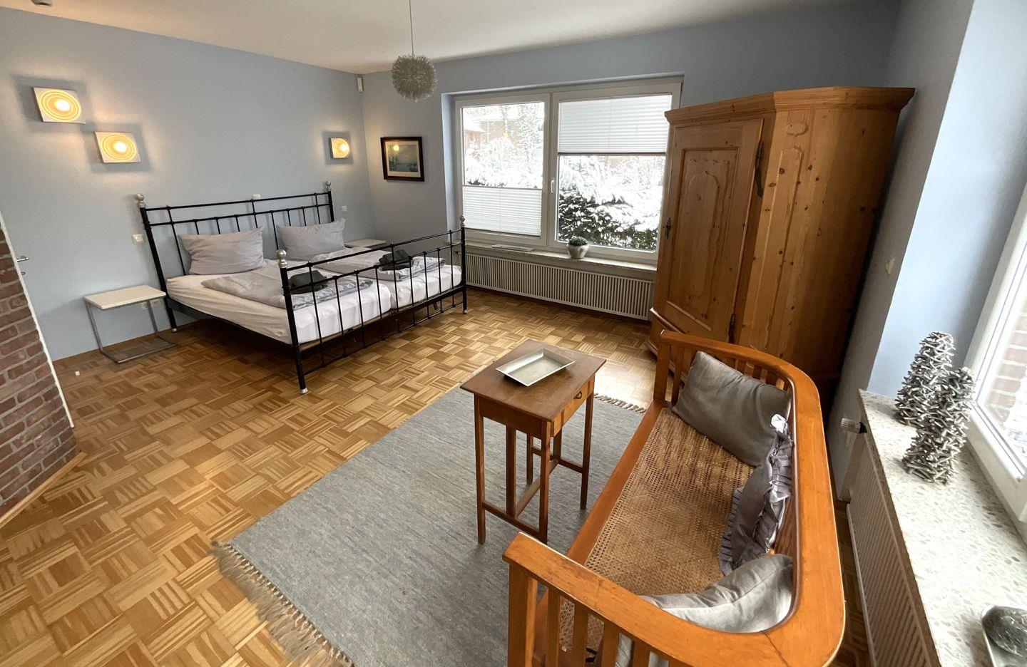 Schlafzimmer 2 Souterrain: Doppelbett (Maße: 180 x 200 cm) mit 2 Matratzen 90x200 cm Leselampe, Kleiderschrank, Gardinen (nicht verdunkelnd) Bettwäsche auf Anfrage