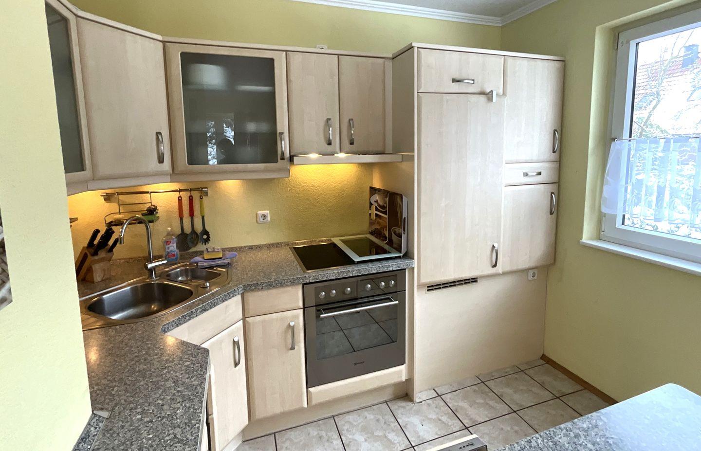 Küche und Haushalt: großer massiver Tisch mit 4 bequemen Stühlen, Einbauküche, Kühlschrank mit Gefrierfach, 4-Zonen Cerankochfeld, Backofen, Mikrowelle, Dunstabzugshaube, Geschirrspüler, Toaster, Wasserkocher, Kaffeefiltermaschine, hochwertiges Geschirr und Besteck